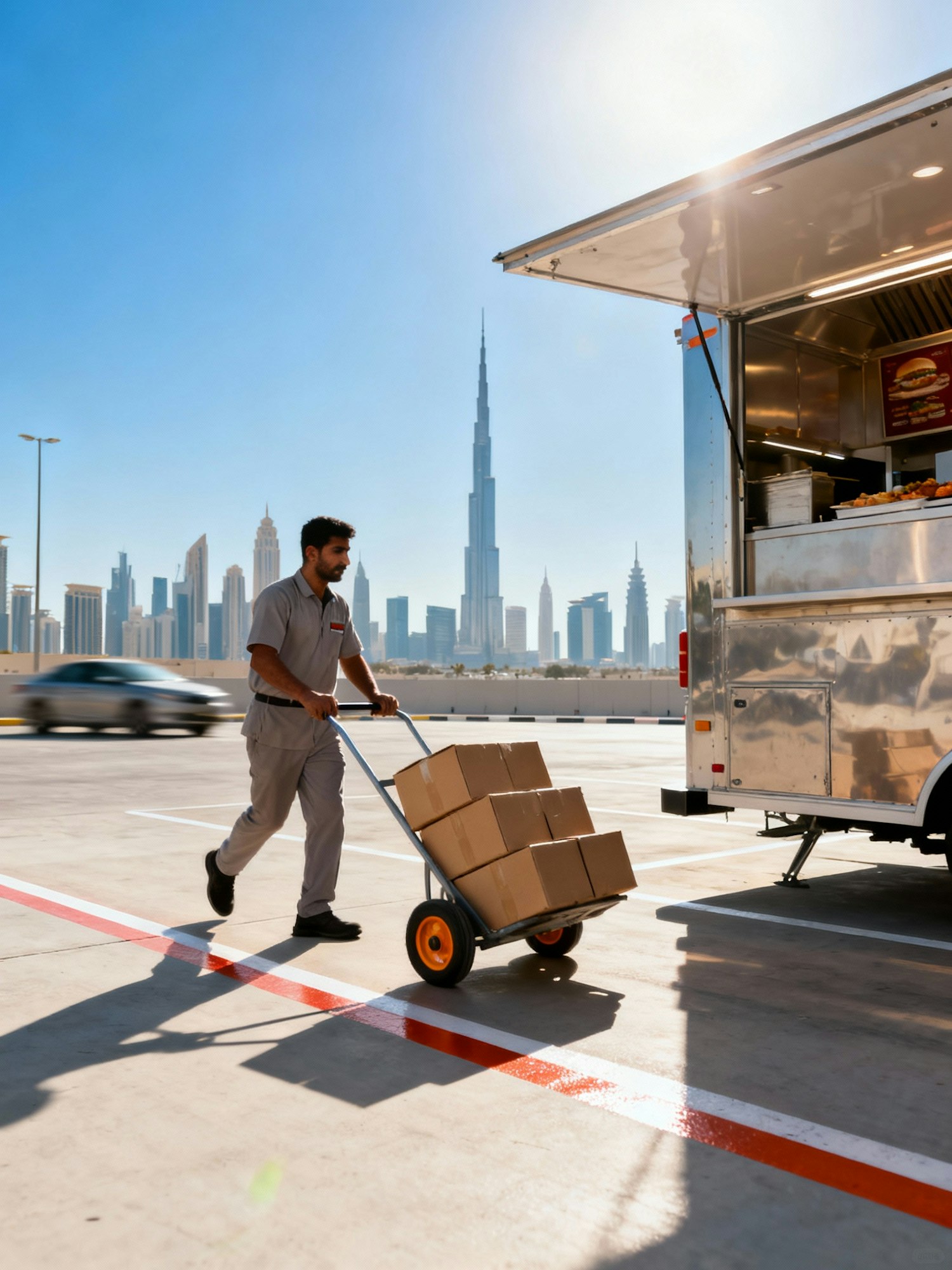 A delivery worker pushes a cart of boxes near a food truck, with a city skyline and a tall skyscraper in the background.