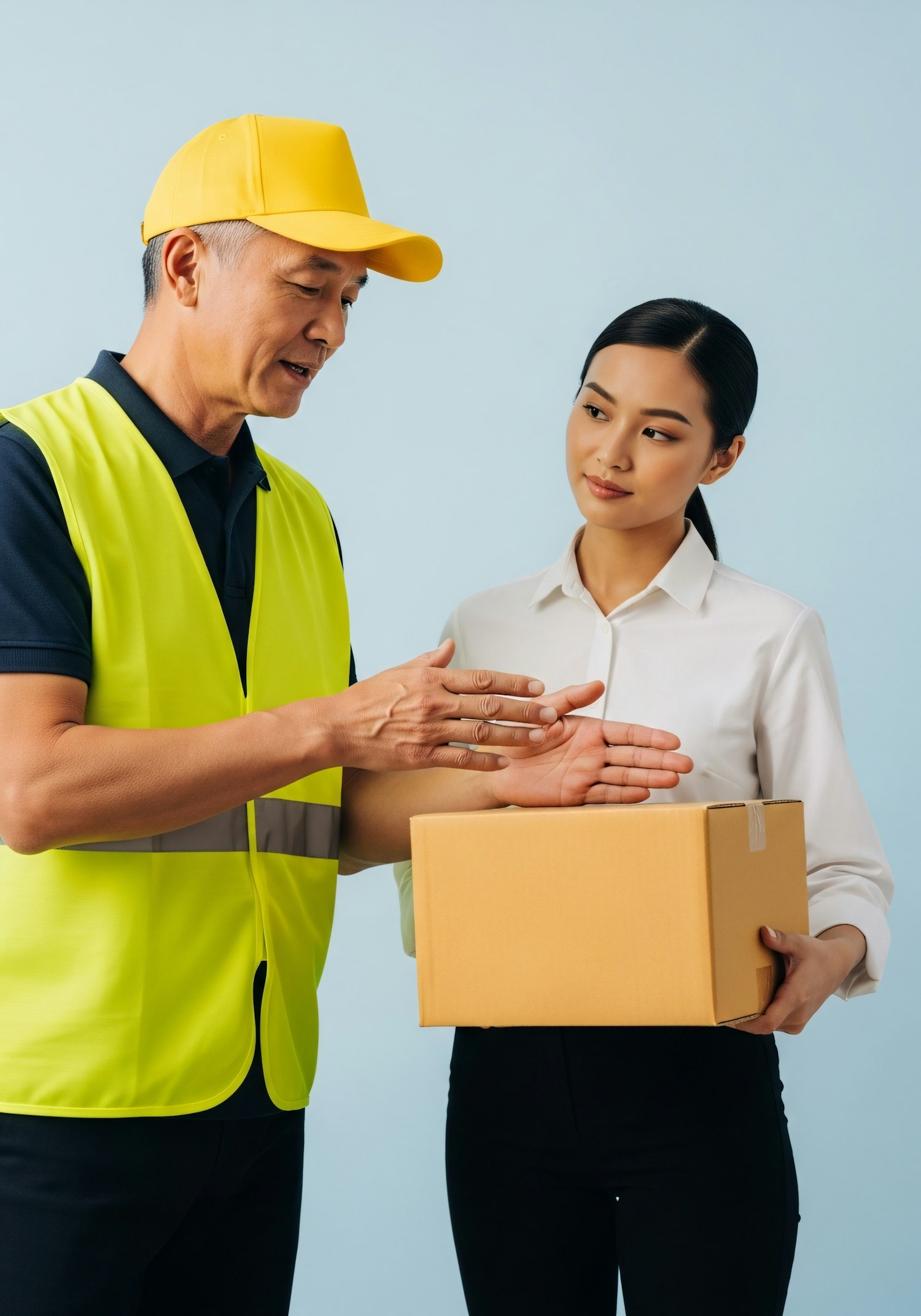 A delivery worker in a yellow vest explains to a woman holding a package against a light blue background.