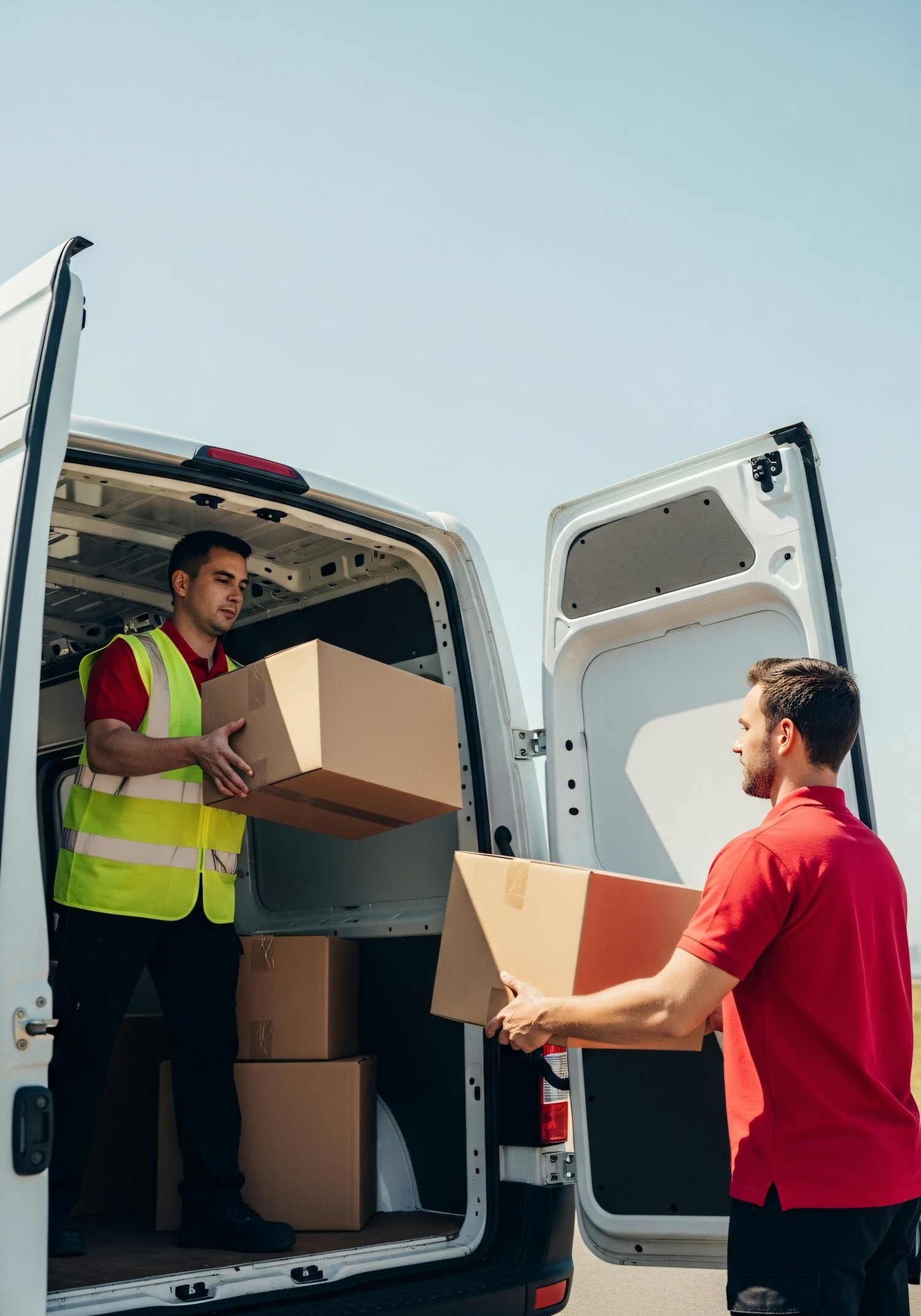Two workers in a delivery van transferring boxes on a sunny day, showcasing teamwork and efficiency in a professional setting.