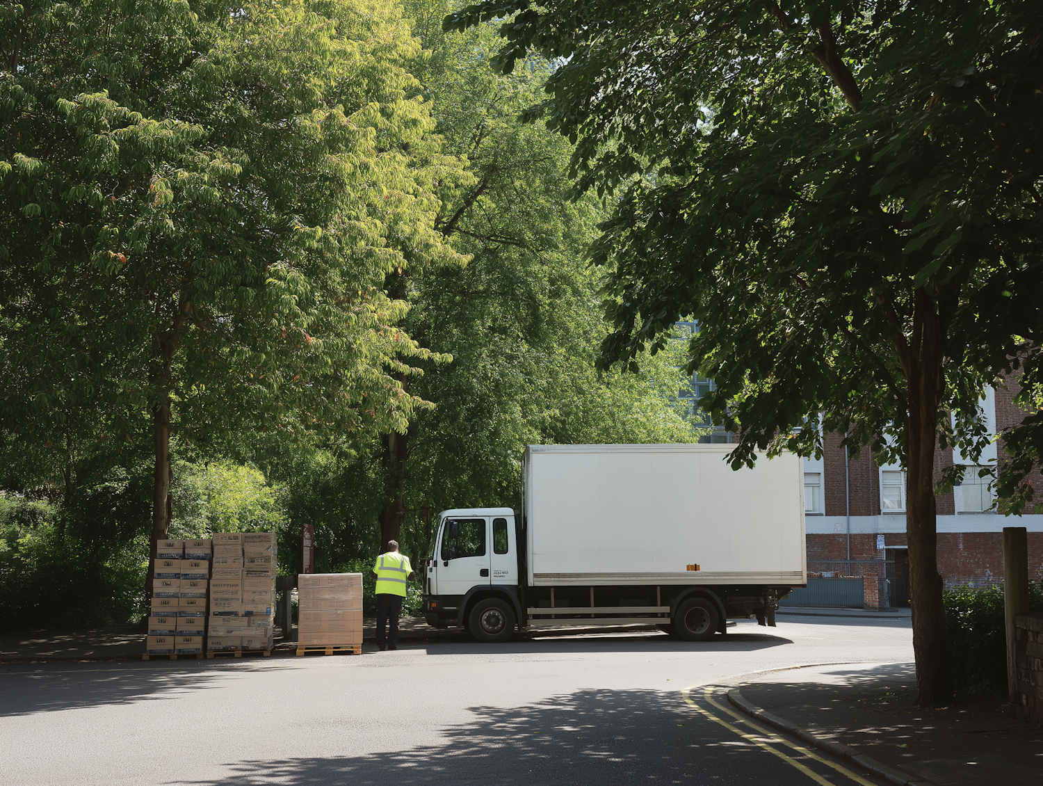 A delivery truck parked on a sunny street, surrounded by trees, with a worker in a high-visibility jacket unloading pallets.
