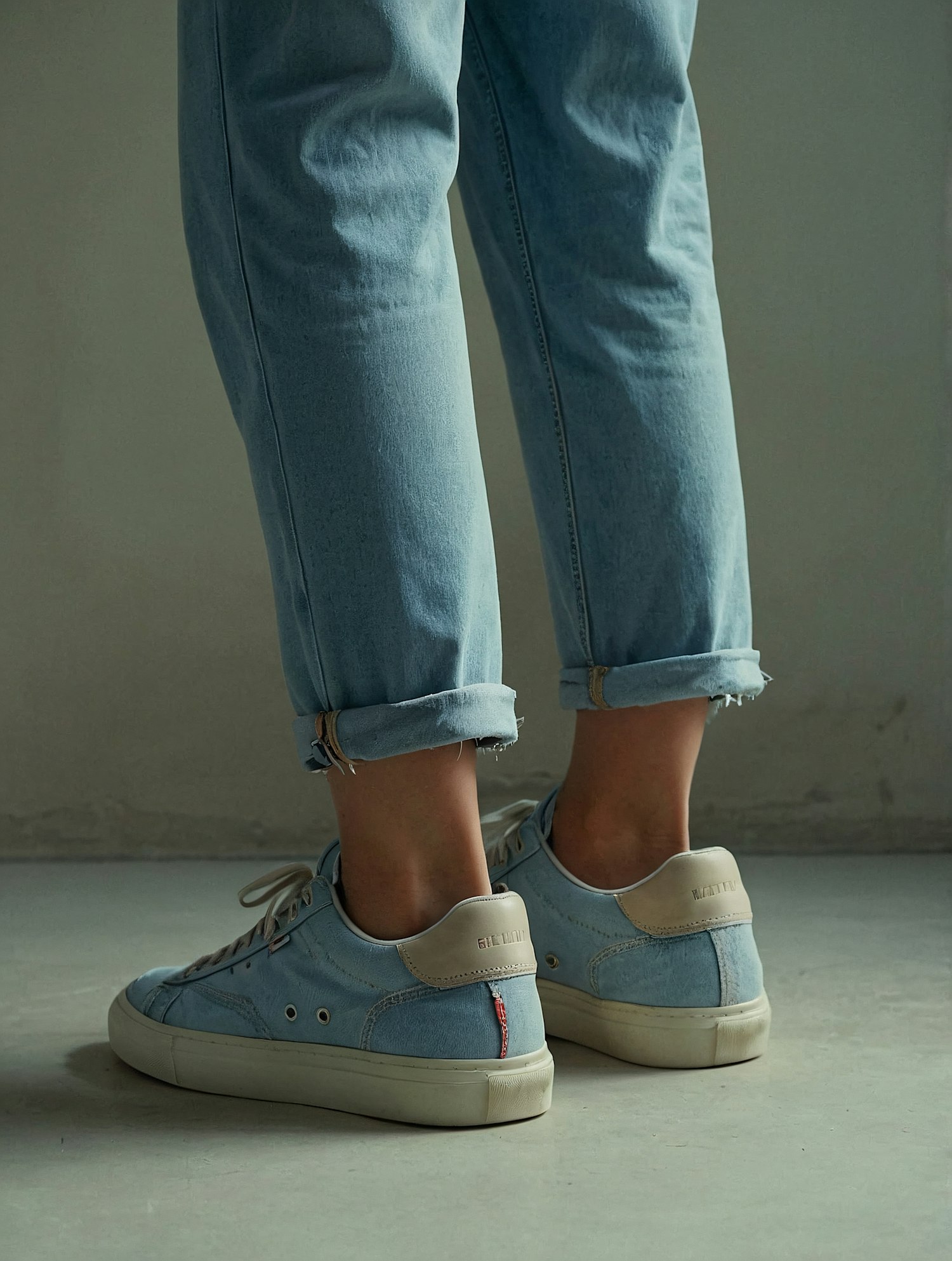 Stylish pastel blue sneakers with beige accents paired with rolled-up light blue jeans on a neutral background.