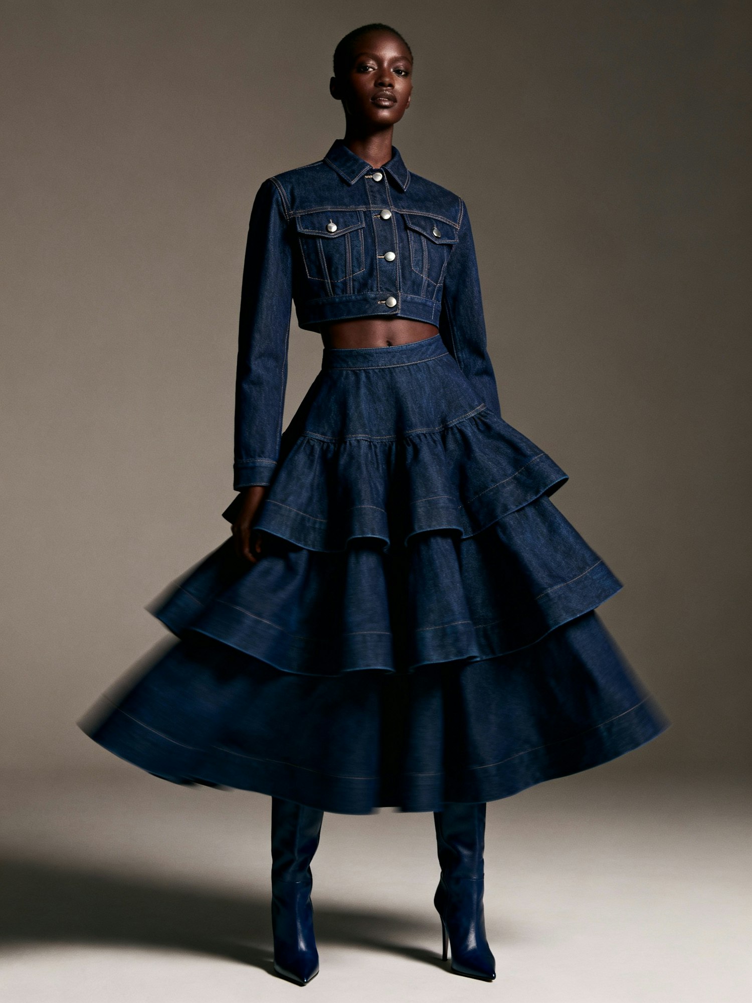 A model showcases a chic denim outfit with a cropped jacket, tiered skirt, and matching boots in a studio setting.