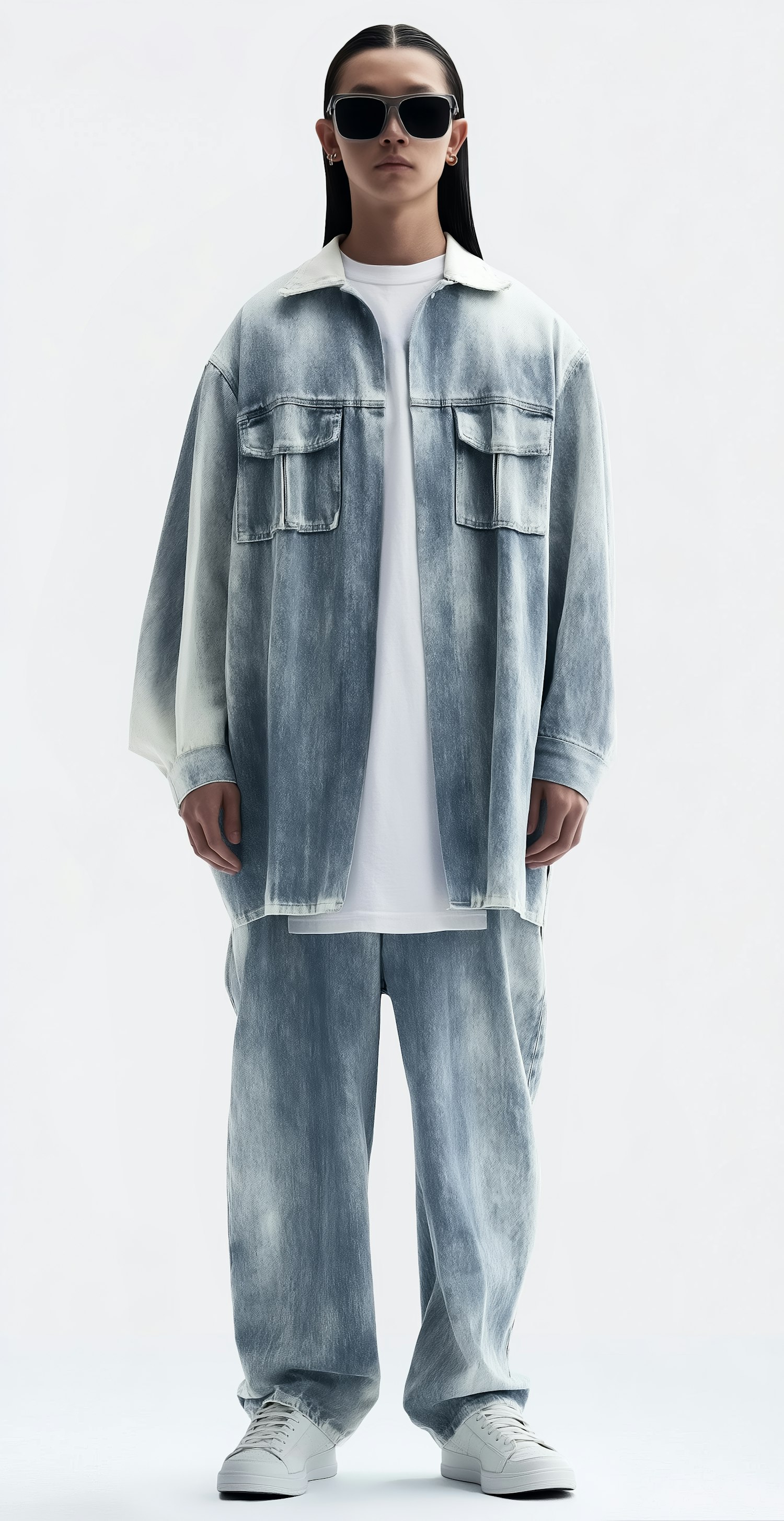 A person in a washed denim outfit with sunglasses and white sneakers, showcasing a modern casual style against a plain background.
