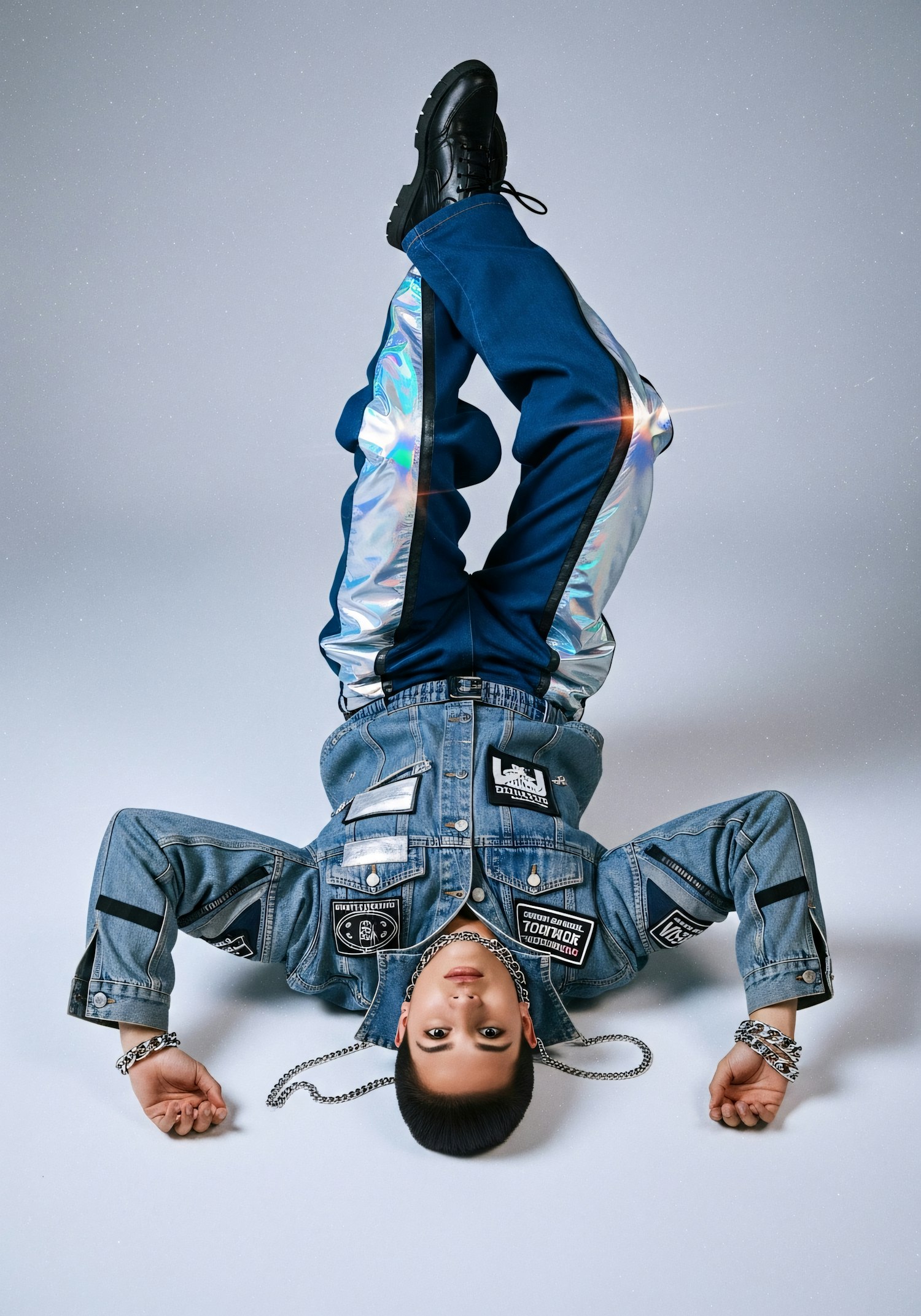 A stylish individual in a denim outfit with reflective accents poses creatively against a light gray background.