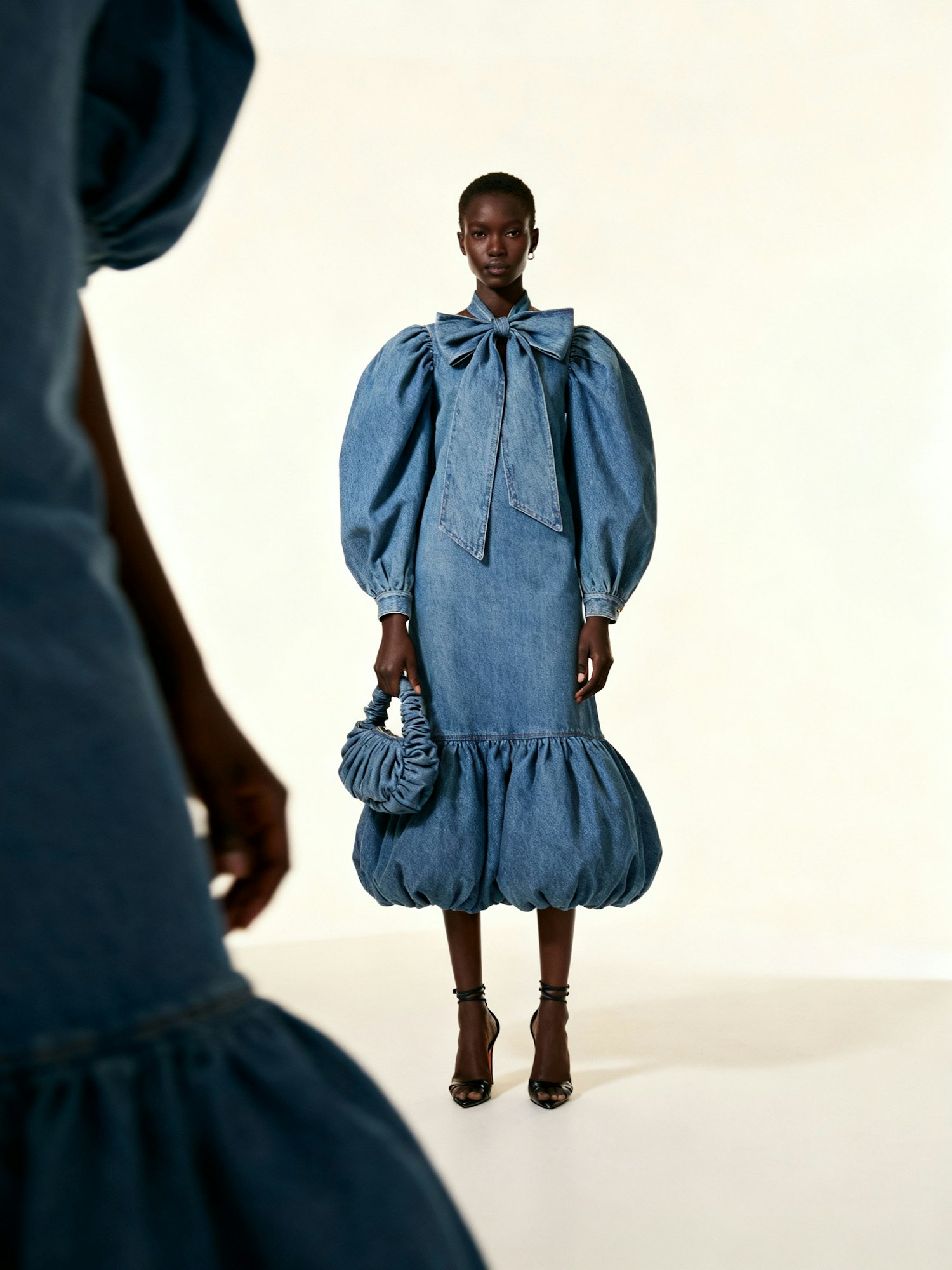 A fashion-forward A Black woman modelling a full-length denim bubble-hem dress with puffed sleeves and a dramatic oversized bow at the neckline. She holds a ruched handbag and wears strappy heels, standing against a clean, minimalist backdrop. The look blends playful femininity with structured modern design, evoking editorial elegance and street-style confidence