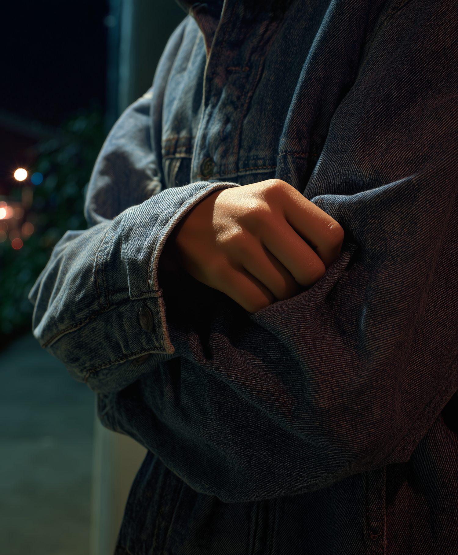 Close-up of a person in a denim jacket with crossed arms, set against a softly lit outdoor night scene with blurred lights.