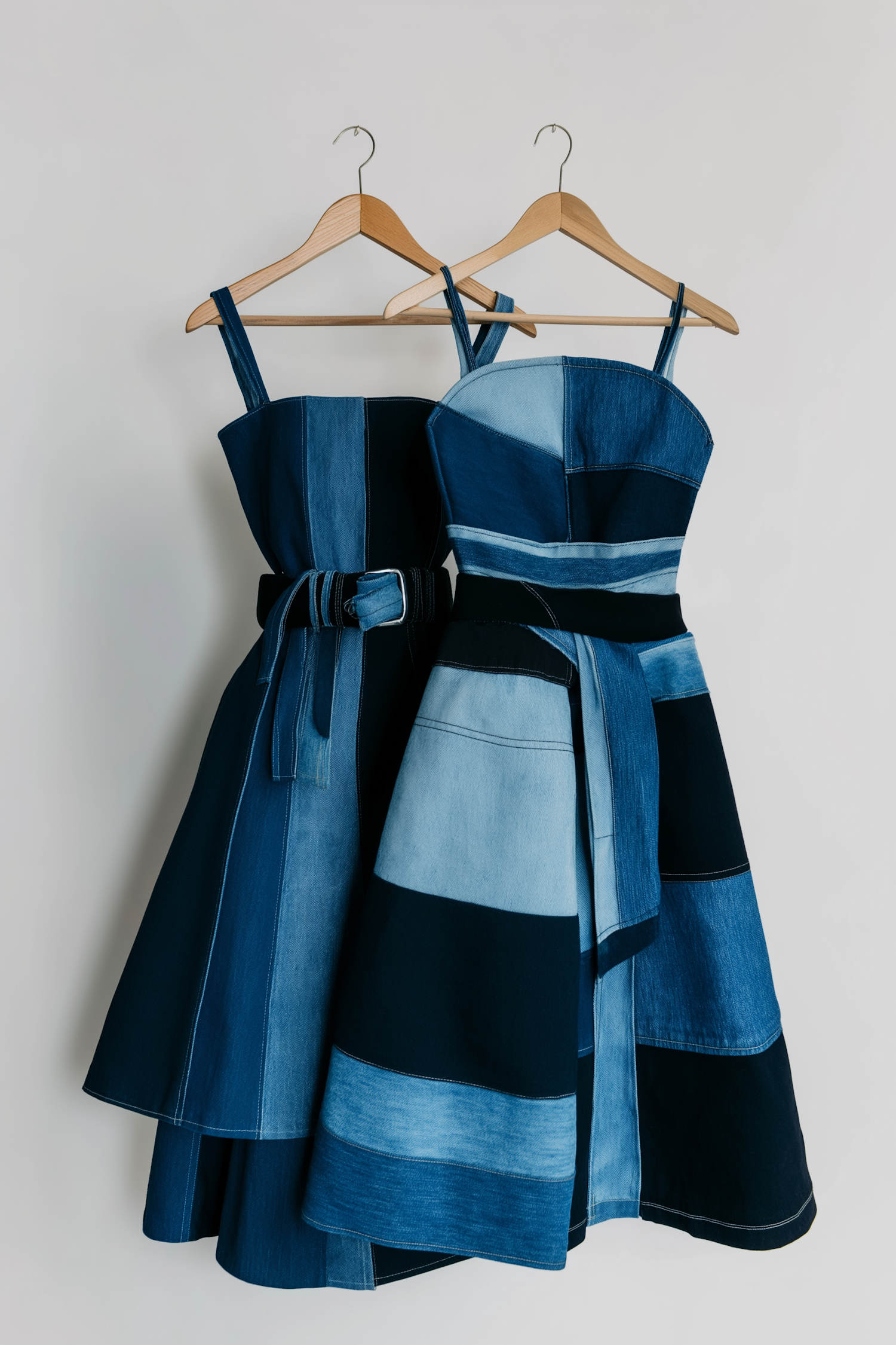 Two stylish denim patchwork dresses with belts, showcasing various shades of blue, hang on wooden hangers against a plain background.