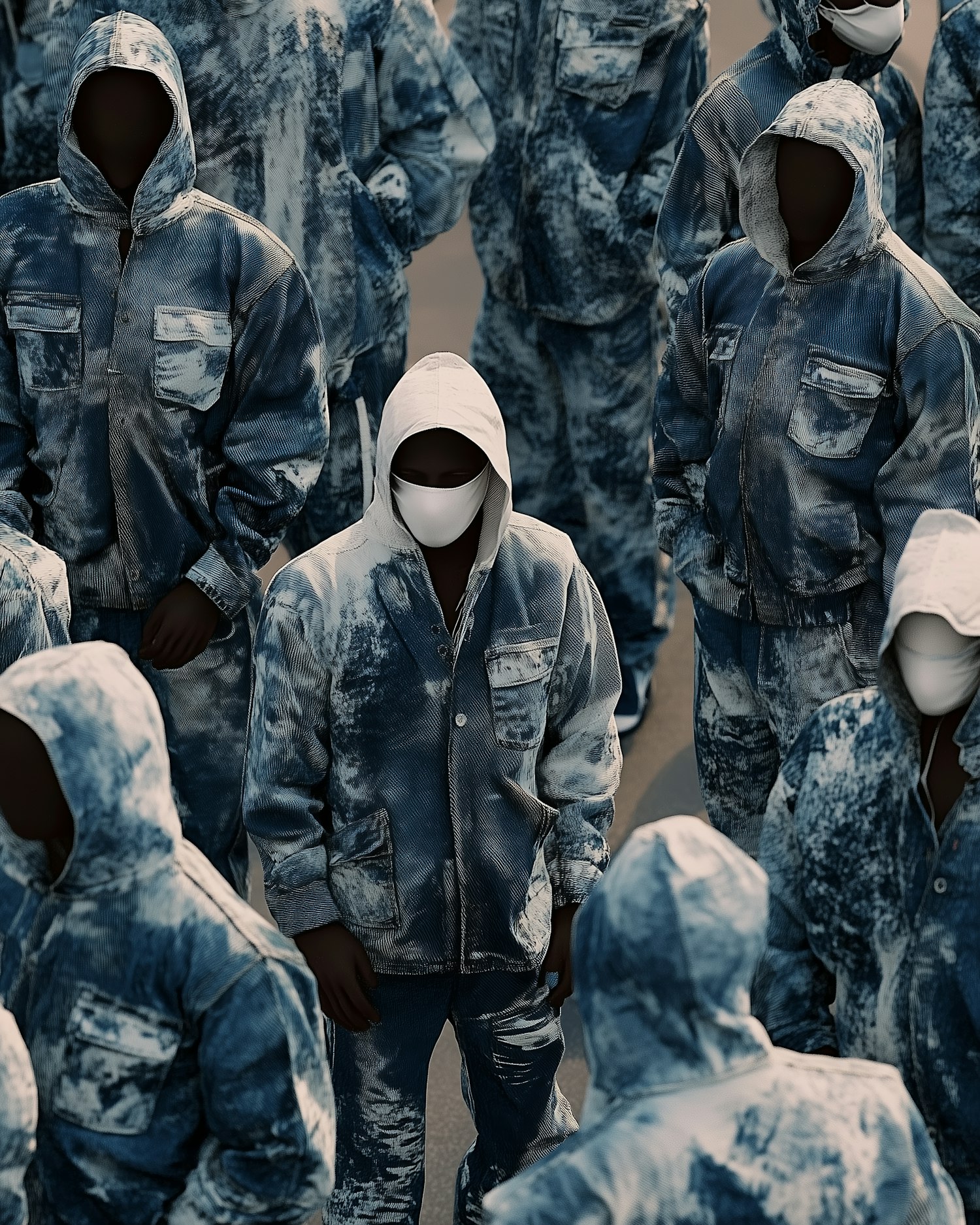 A group of people in matching bleached denim outfits with hoods and masks, creating a striking and uniform visual effect.