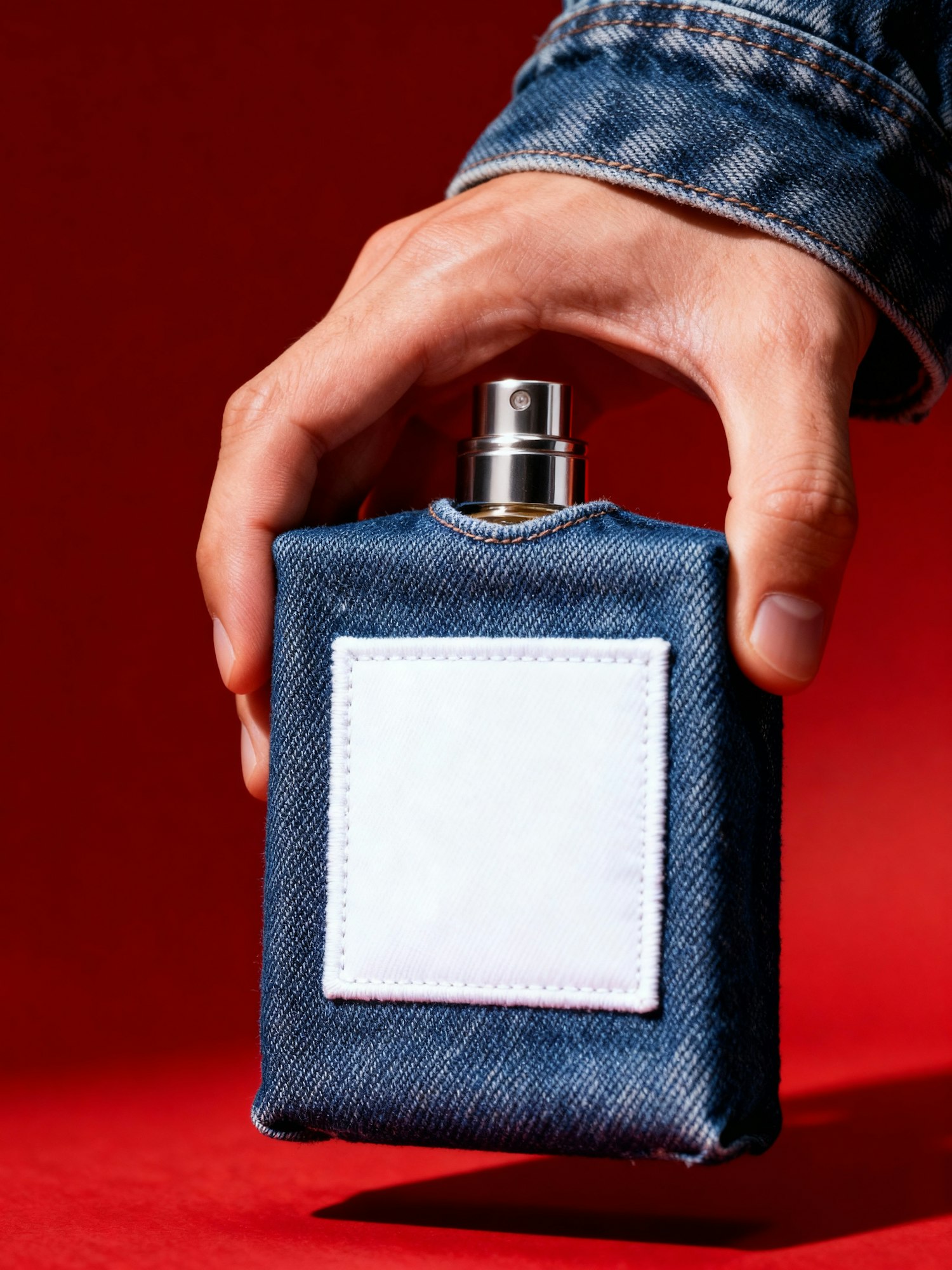 A hand holds a denim-wrapped perfume bottle with a white patch, set against a bold red background, creating a striking visual contrast.