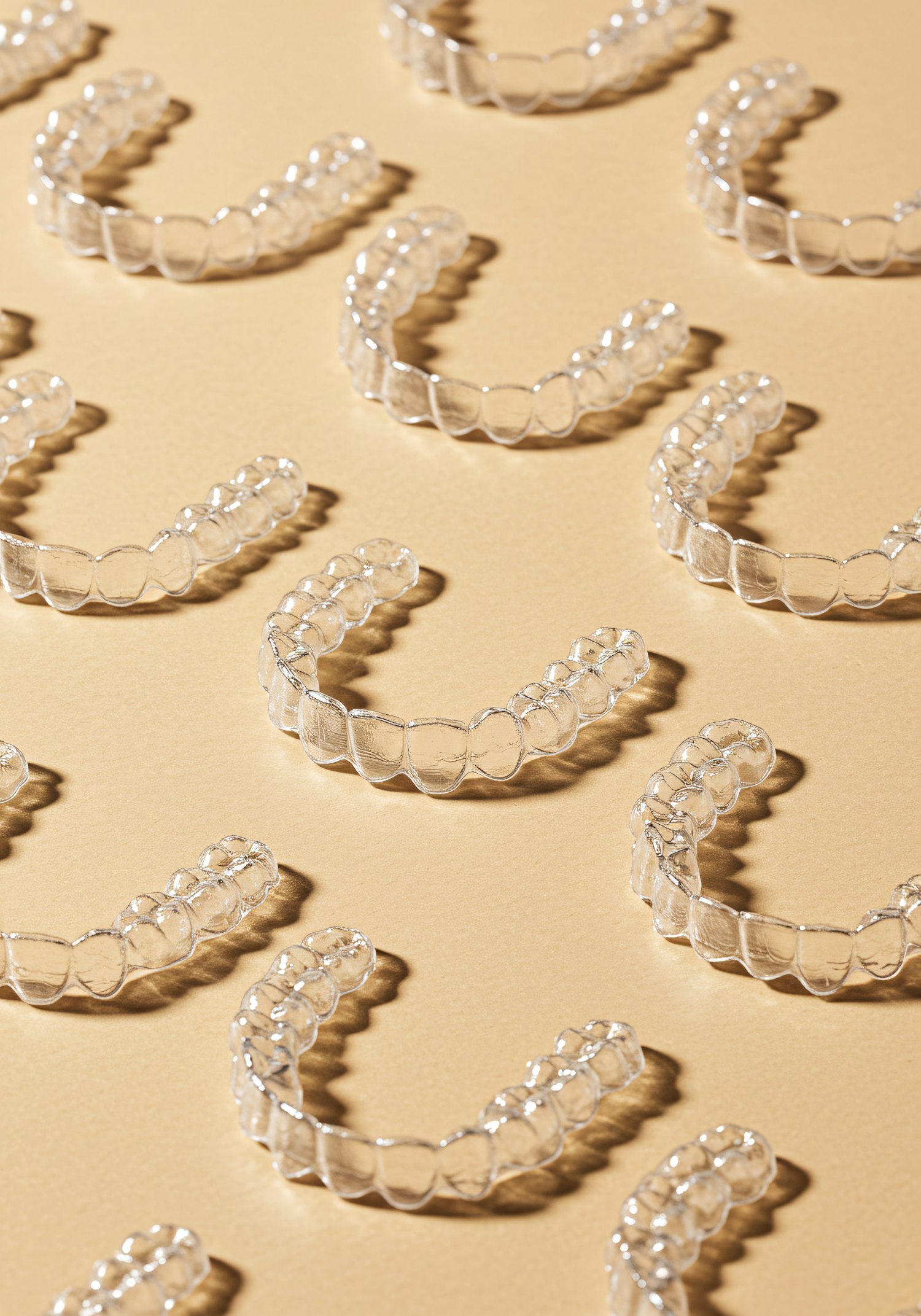 A neat arrangement of clear dental aligners on a beige background, showcasing their transparency and detailed contours.
