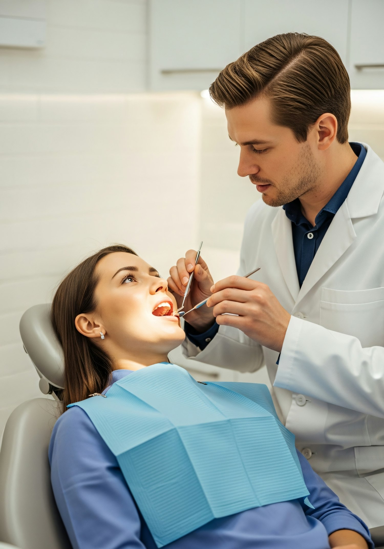 A dentist examines a patient's teeth in a clean, modern clinic, showcasing a professional dental care setting.
