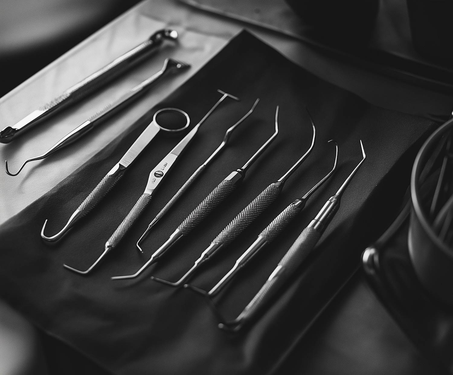 Monochromatic image of dental tools on a dark cloth, featuring picks, a mirror, and a scaler with textured grips and polished metal finish.