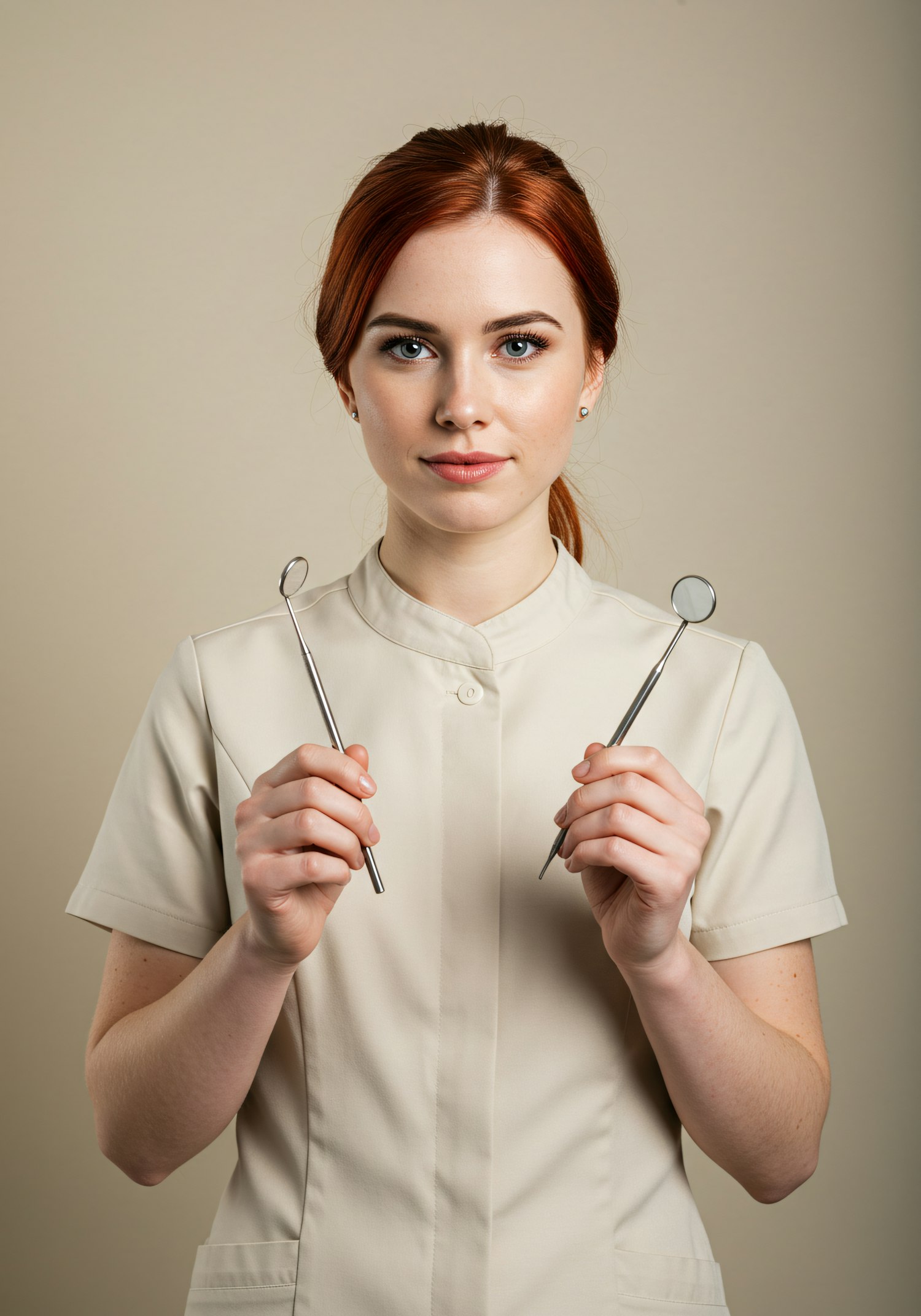 A professional woman in a beige uniform holding dental tools, with a neutral expression and a plain beige background.