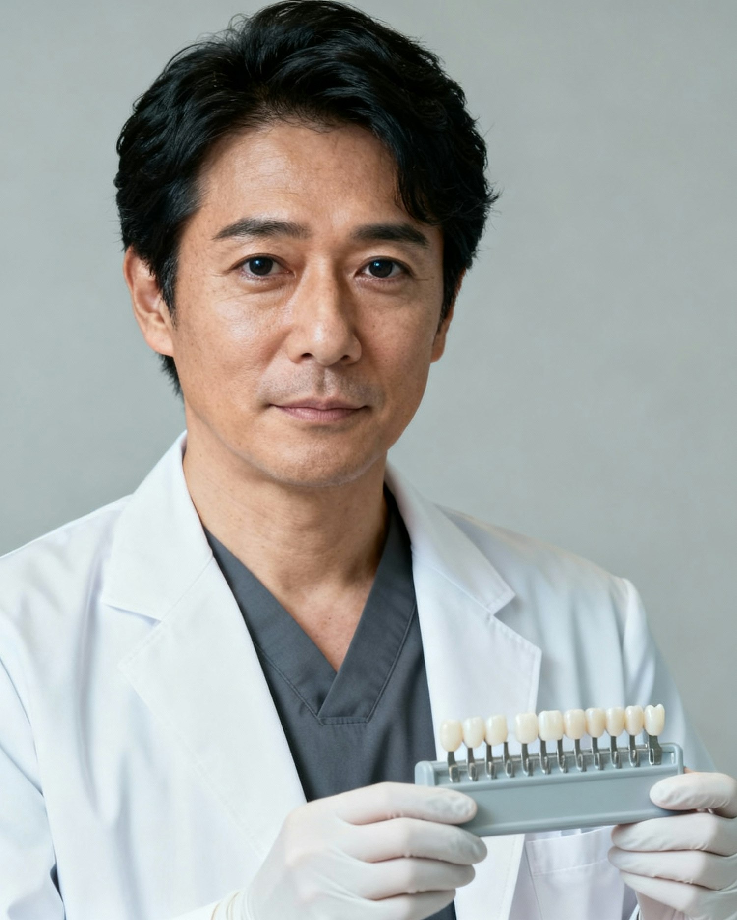 Studio portrait of a Japanese male prosthodontist in his forties; light-medium skin, neutral-cool; neat textured black hair; dark eyes; white coat over charcoal scrub top, gloved hands holding a shade guide (generic); framing: head fully visible, slight headroom; neutral seamless; Rembrandt lighting; 105mm macro-sharp; photorealistic. Expression: precise calm. Negative: plastic skin, brand logos, forehead cut.