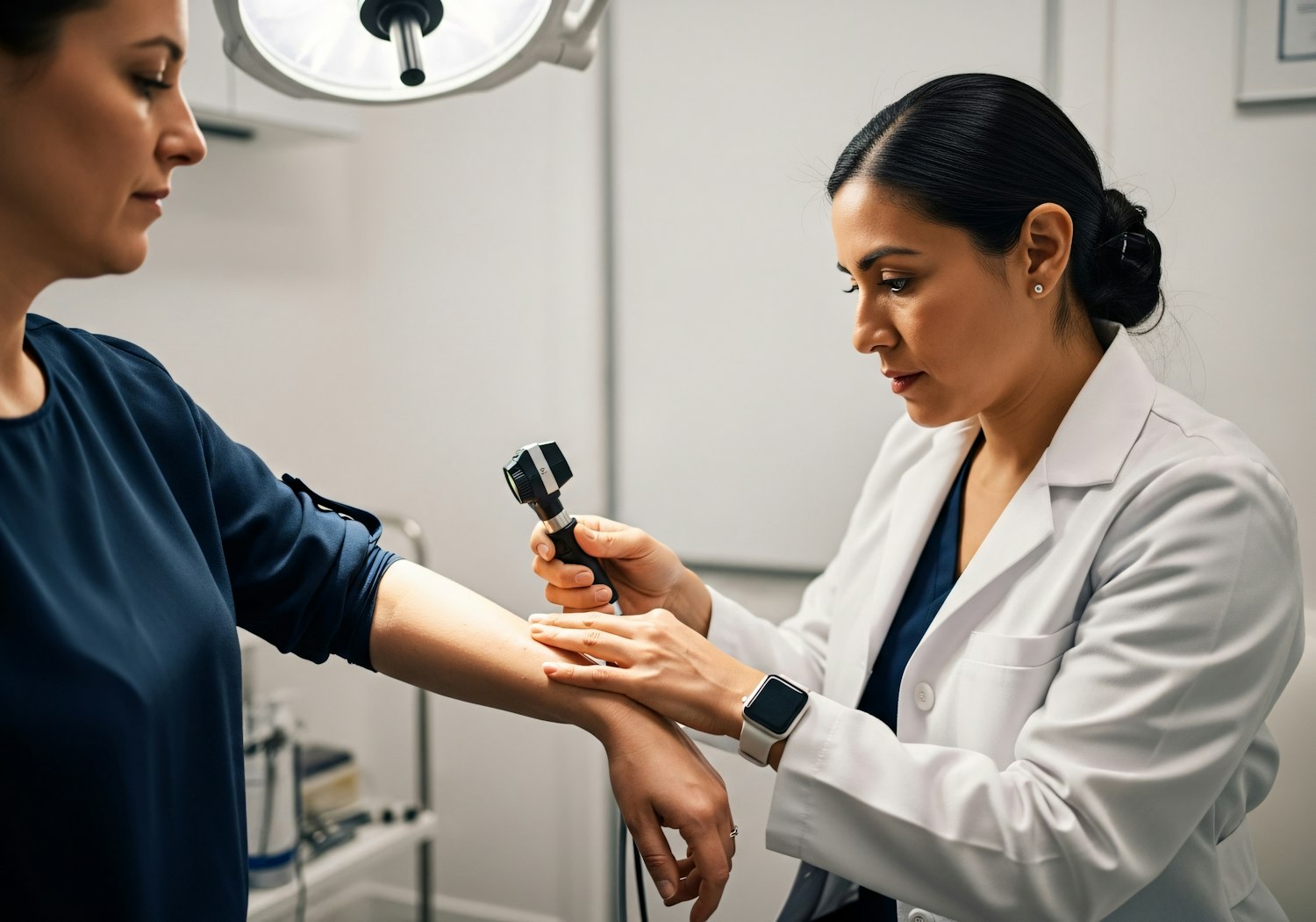 A doctor examines a patient's arm with a dermatoscope in a well-lit clinic, showcasing a professional medical consultation.