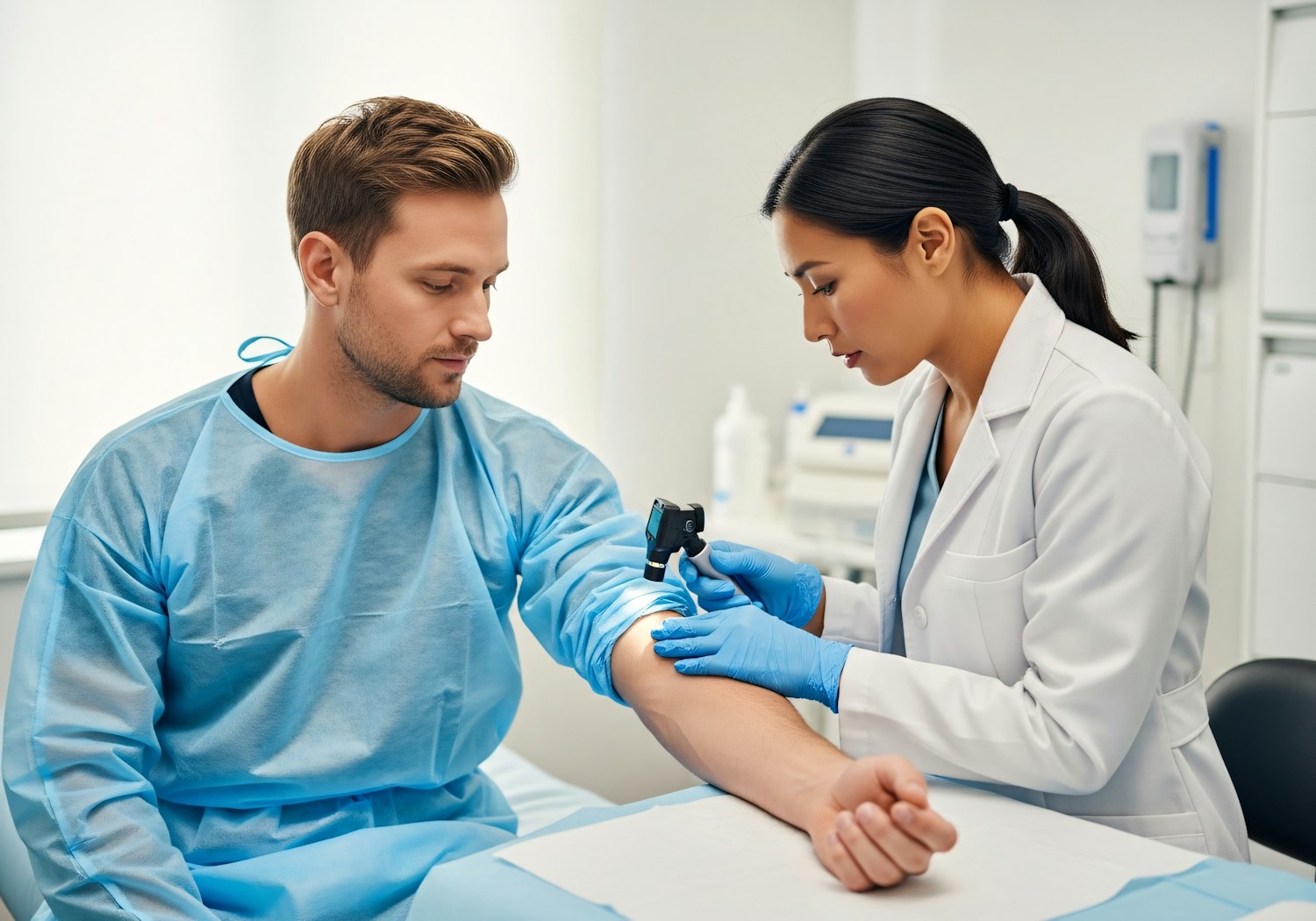 A doctor examines a patient's arm with a dermatoscope in a clinical setting, showcasing a professional medical consultation.