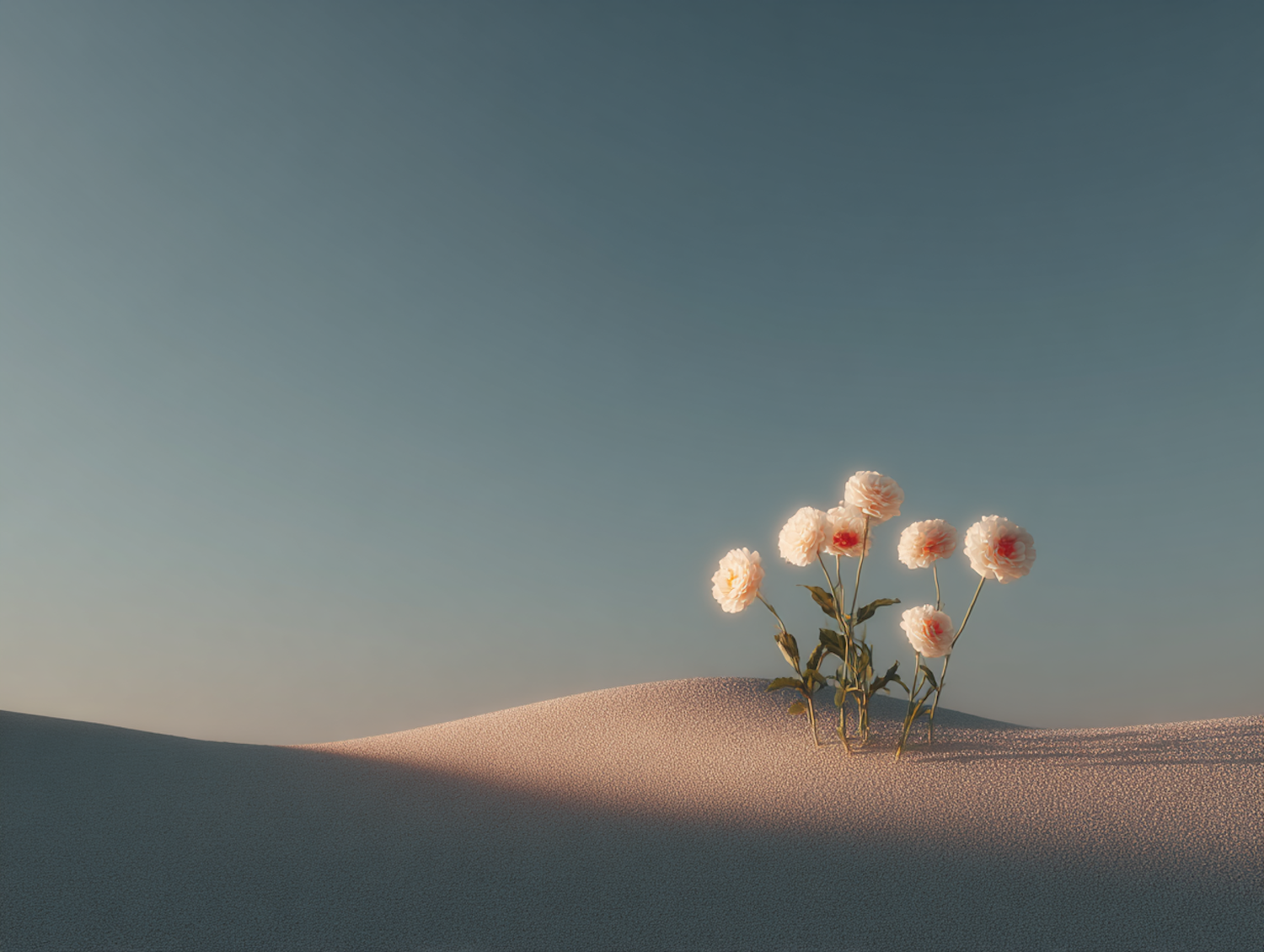 A cluster of pink flowers blooms in a serene desert landscape, contrasting beautifully with the soft sand dunes and clear blue sky.