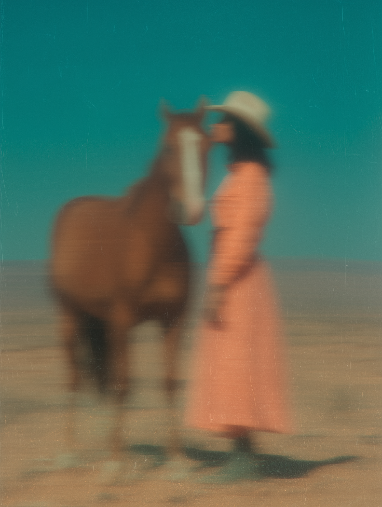 A blurred image of a person in a hat and dress standing beside a horse in a desert, with a teal sky and warm, earthy tones.