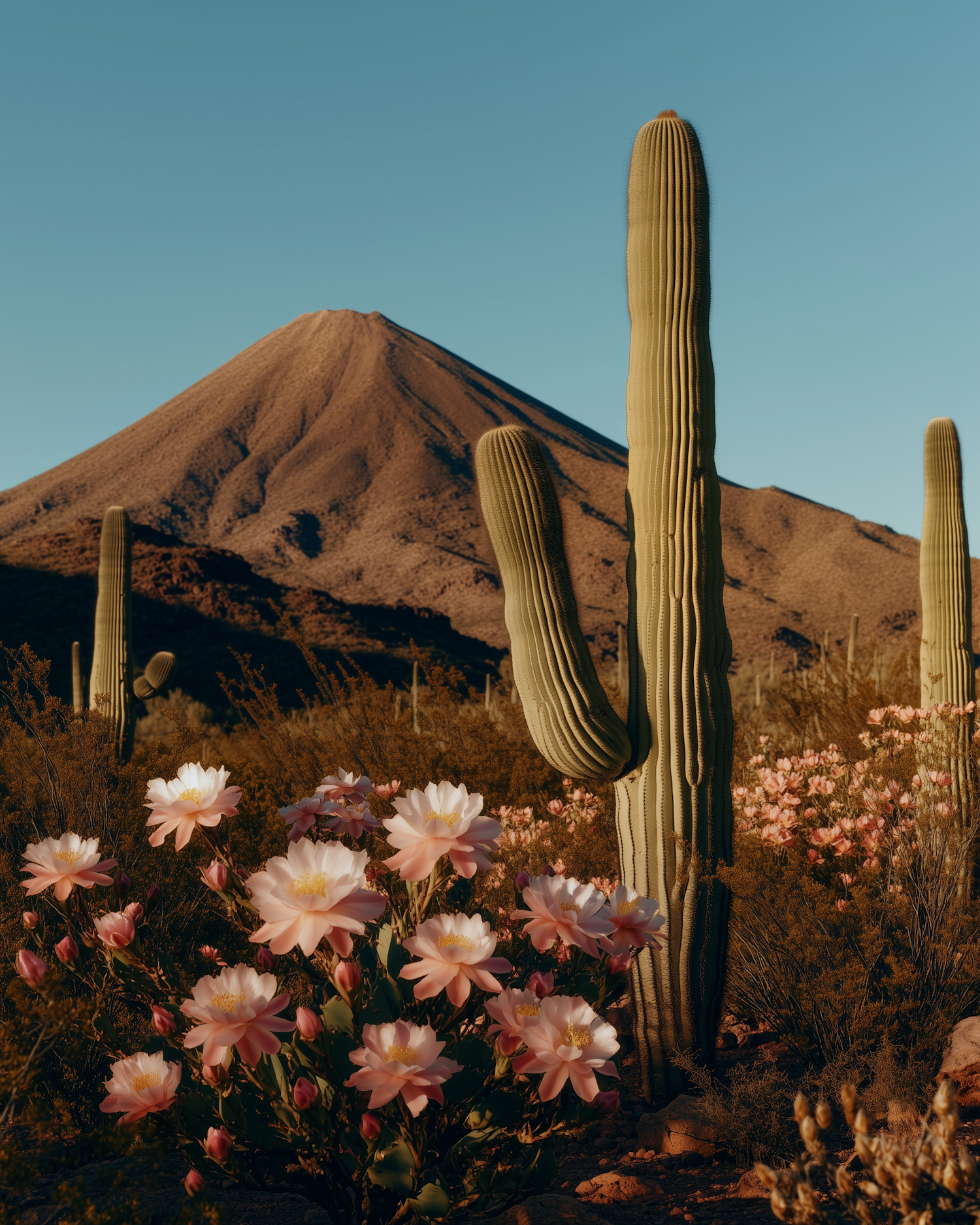A stunning desert scene with blooming pink cactus flowers, towering saguaro cacti, and a majestic mountain under a clear blue sky.