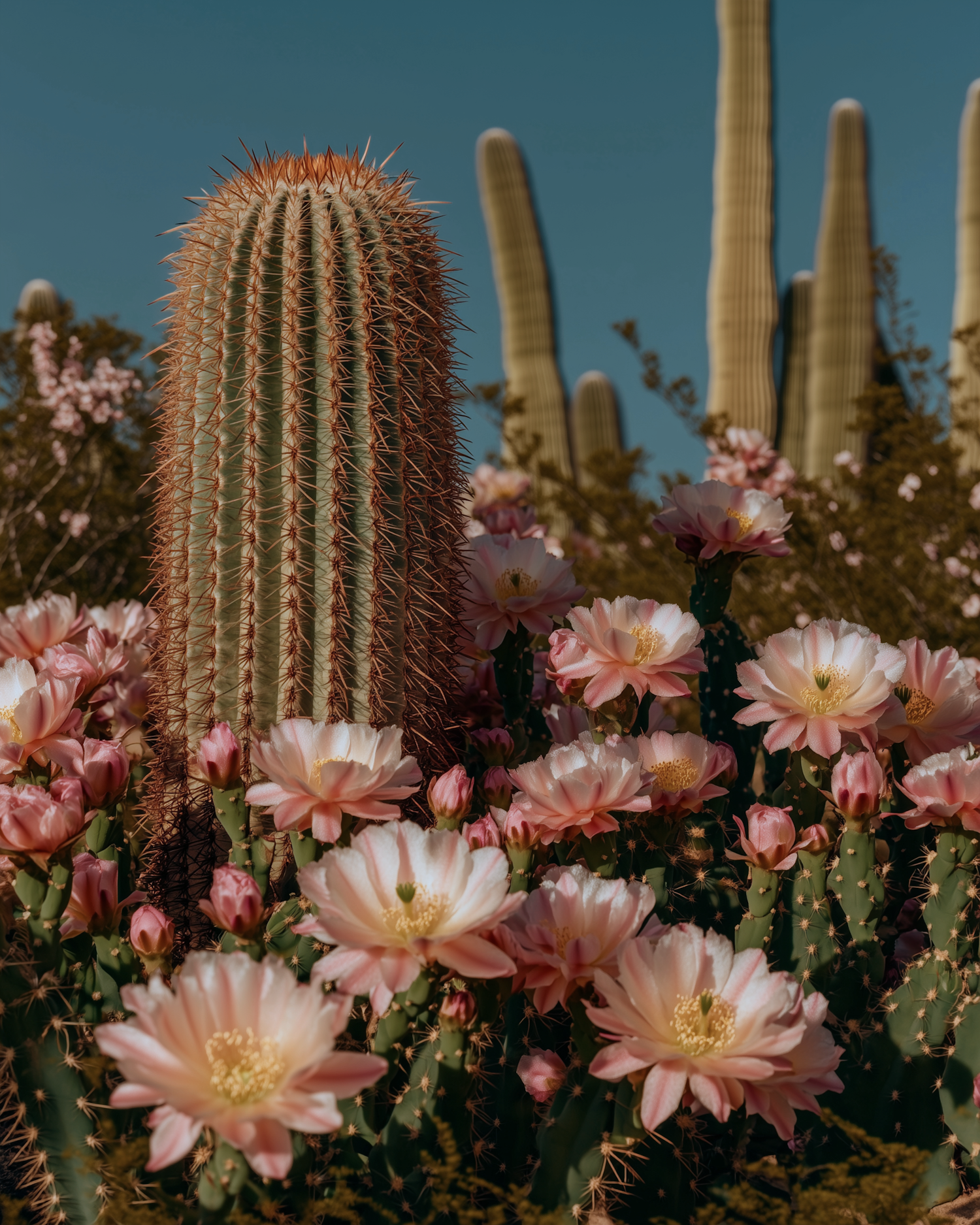 A desert cactus surrounded by blooming pink flowers under a clear blue sky, with tall saguaro cacti in the background.