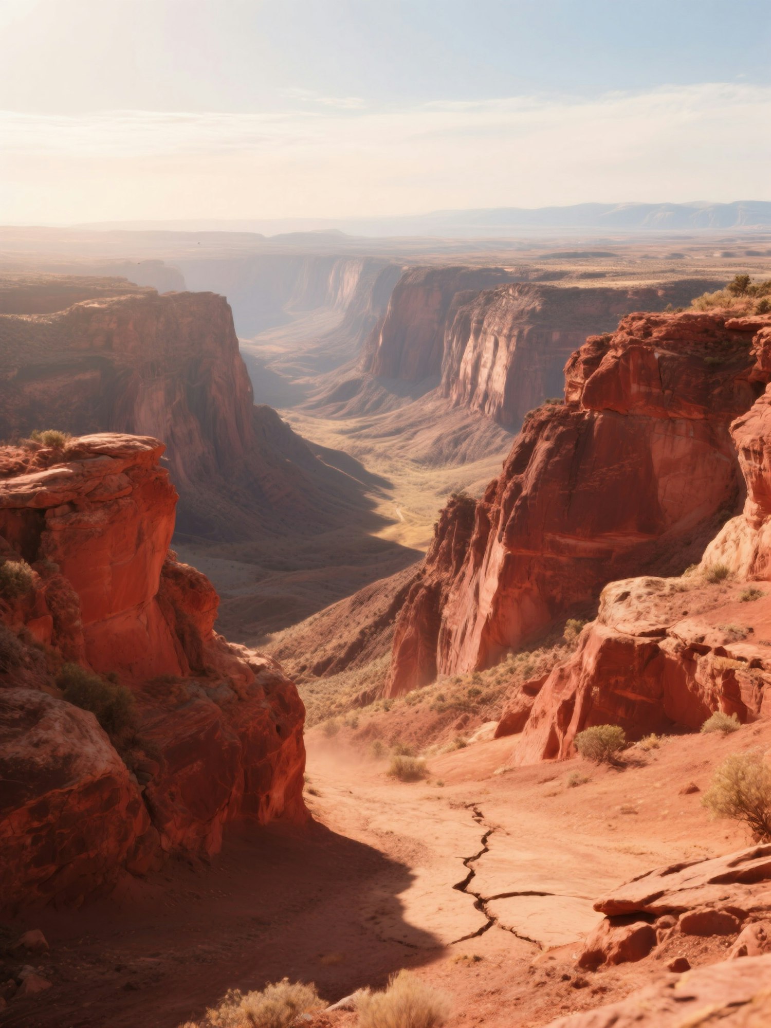 Stunning desert canyon with red rock formations, a winding valley, and warm sunlight highlighting the rugged landscape.