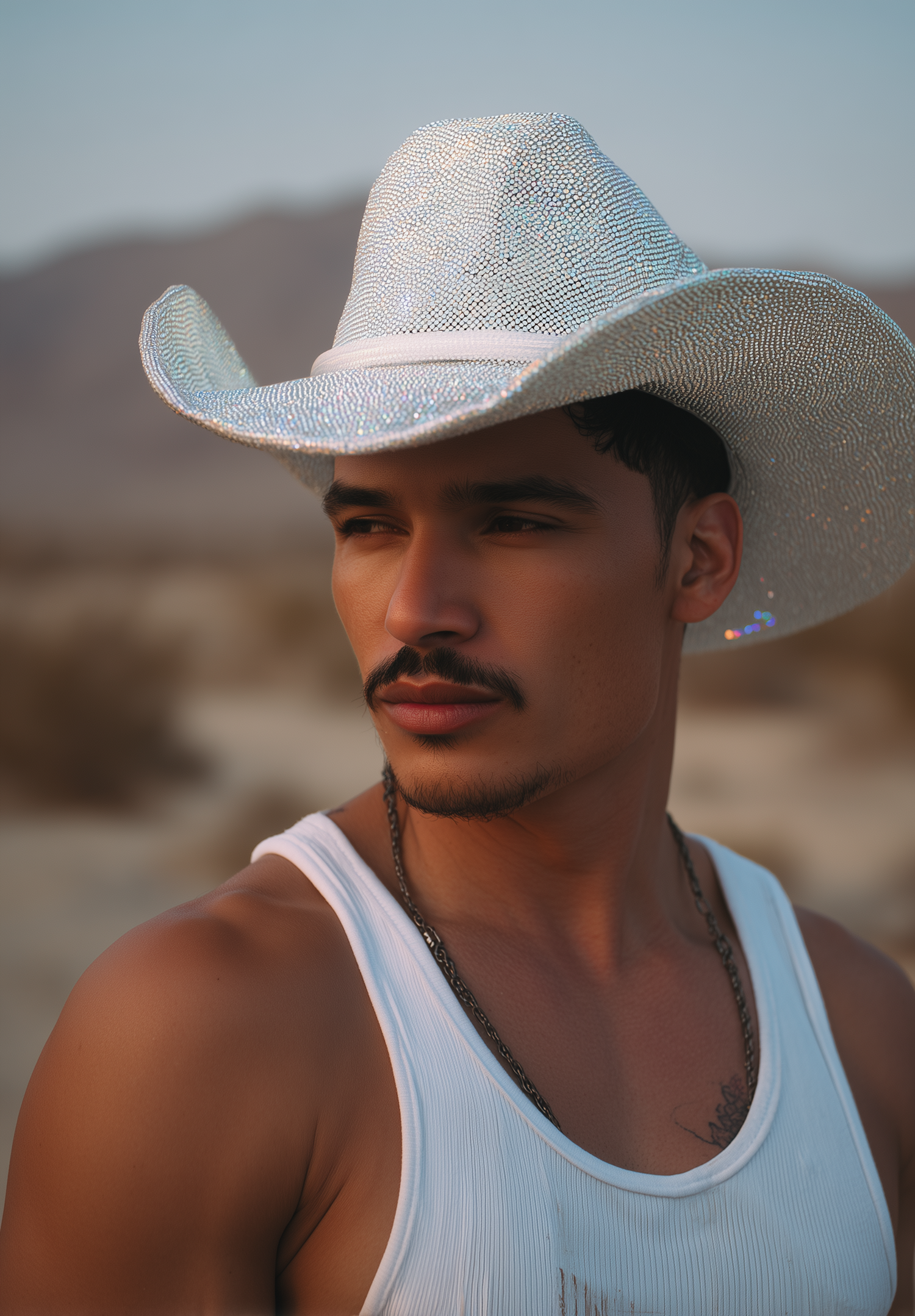 A man in a sparkling silver cowboy hat and white tank top gazes into the distance in a warm desert setting.