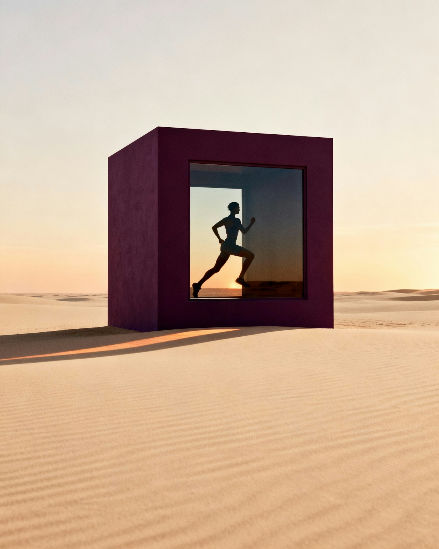 High-end editorial sports photography, soft directional lighting, sculptural shadows, premium activewear textures, muted beige and deep plum tones, clean minimal background, cinematic sophistication, realistic skin texture, no overprocessed look, elegant composition, high-fashion athletic aesthetic. A minimalist deep-plum architectural cube standing in the middle of a beige desert landscape. Soft sunset light, warm shadows stretching across the sand. Reflective tinted glass window, hinting at a silhouette moving inside. Clean lines, surreal calm atmosphere, premium editorial campaign energy