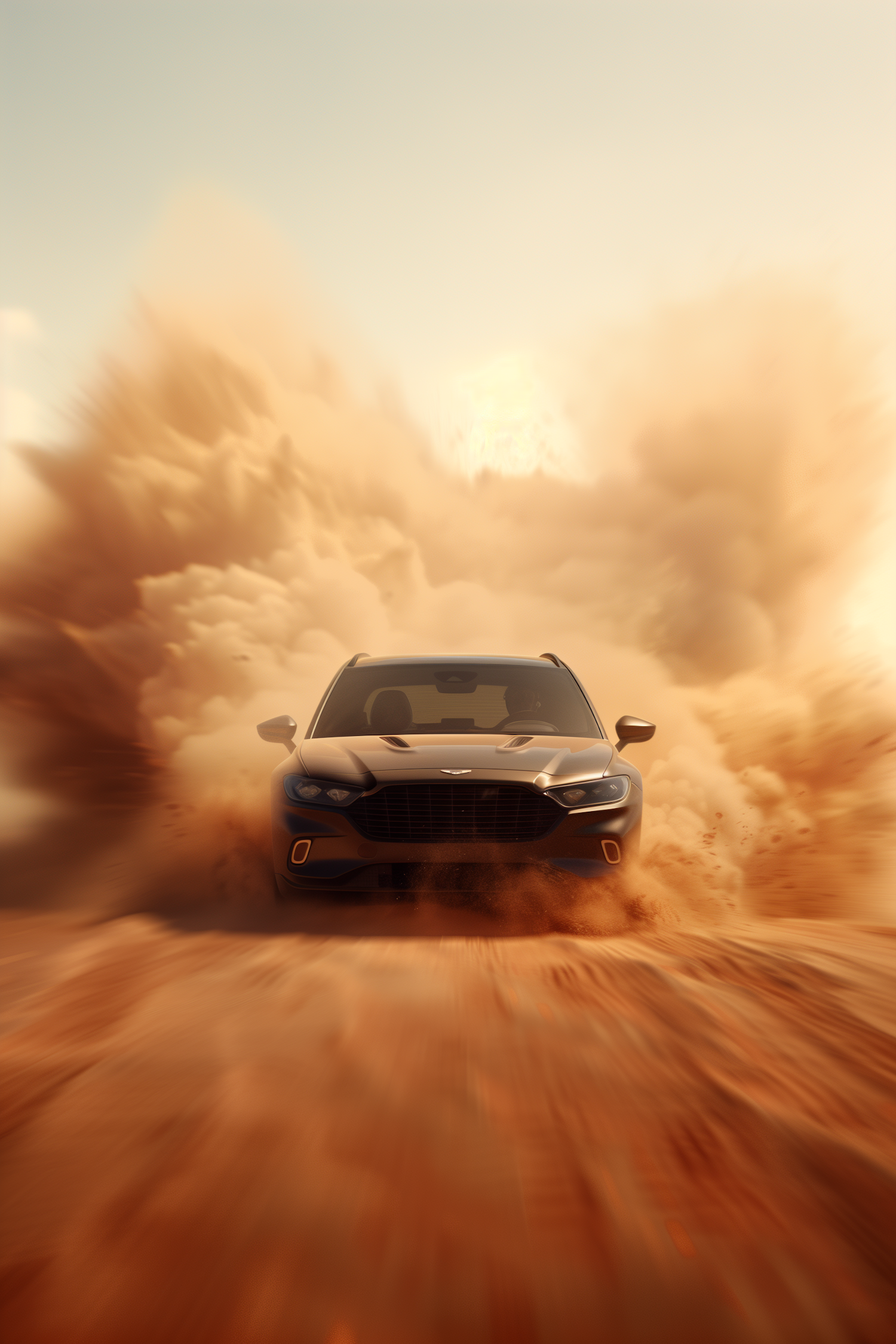 A dynamic shot of a sleek car speeding through a desert, surrounded by a dramatic dust cloud under a golden sky.