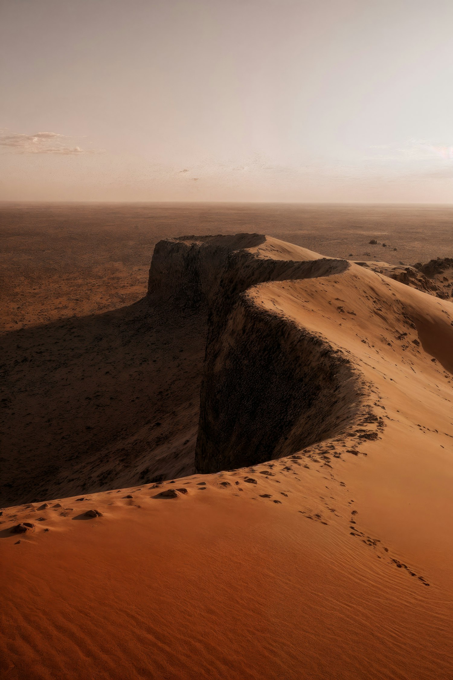 A stunning desert scene with a curving sand dune ridge, shadowed valley, and endless horizon under a hazy sky.