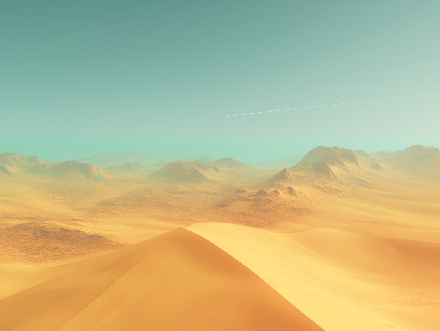 Vast desert landscape with golden sand dunes and distant mountains under a clear blue sky, featuring a thin contrail above.
