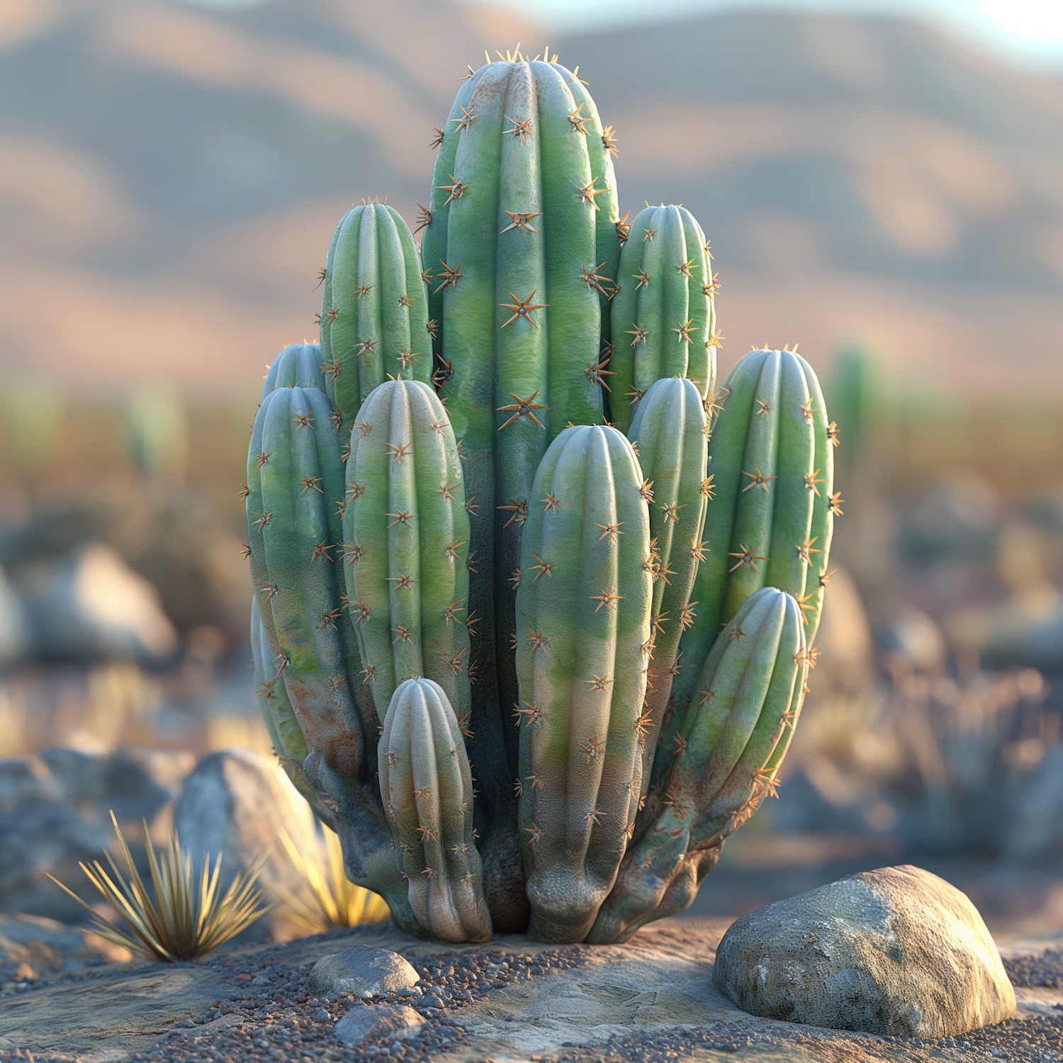 Vibrant green cacti in a sunlit desert landscape, showcasing ribbed texture and spines against a blurred, rocky background.
