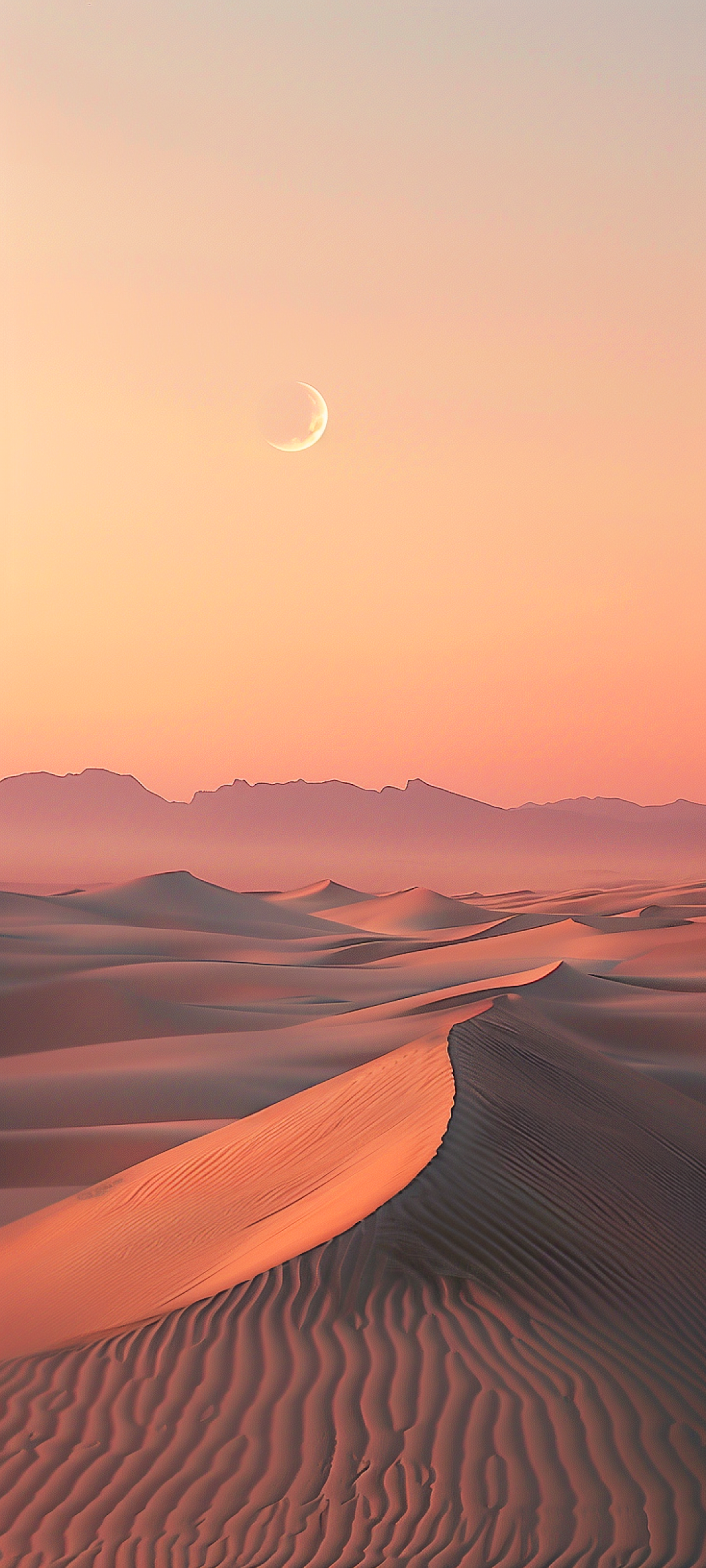 Serene desert landscape with pink-orange hues, crescent moon, and distant mountains. Tranquil and ethereal atmosphere.