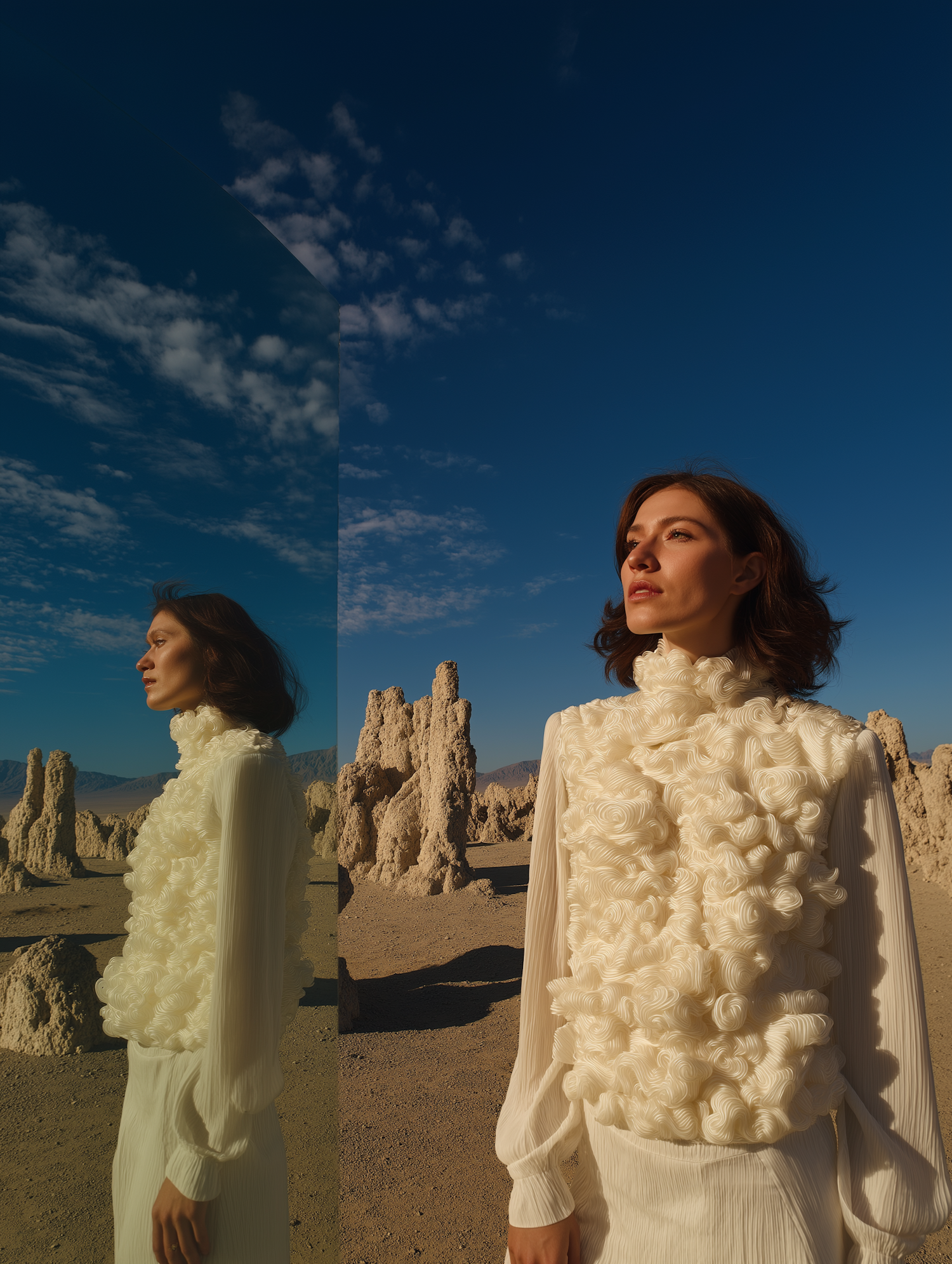 A woman in a textured white outfit stands in a desert with rock formations, her reflection visible in a mirror under a vivid blue sky.