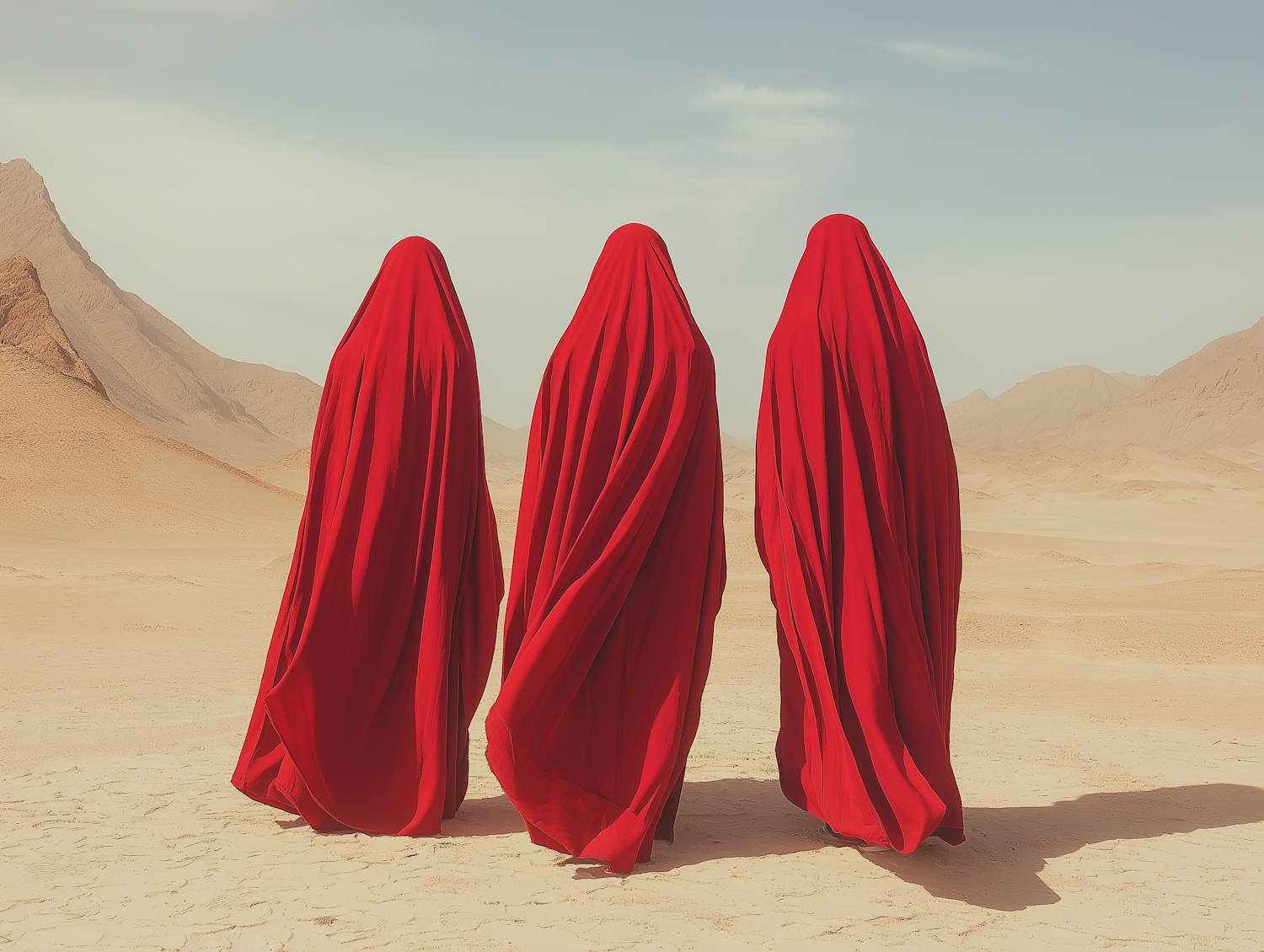 Three figures in red cloaks stand in a vast desert, creating a striking contrast against the sandy landscape and distant mountains.