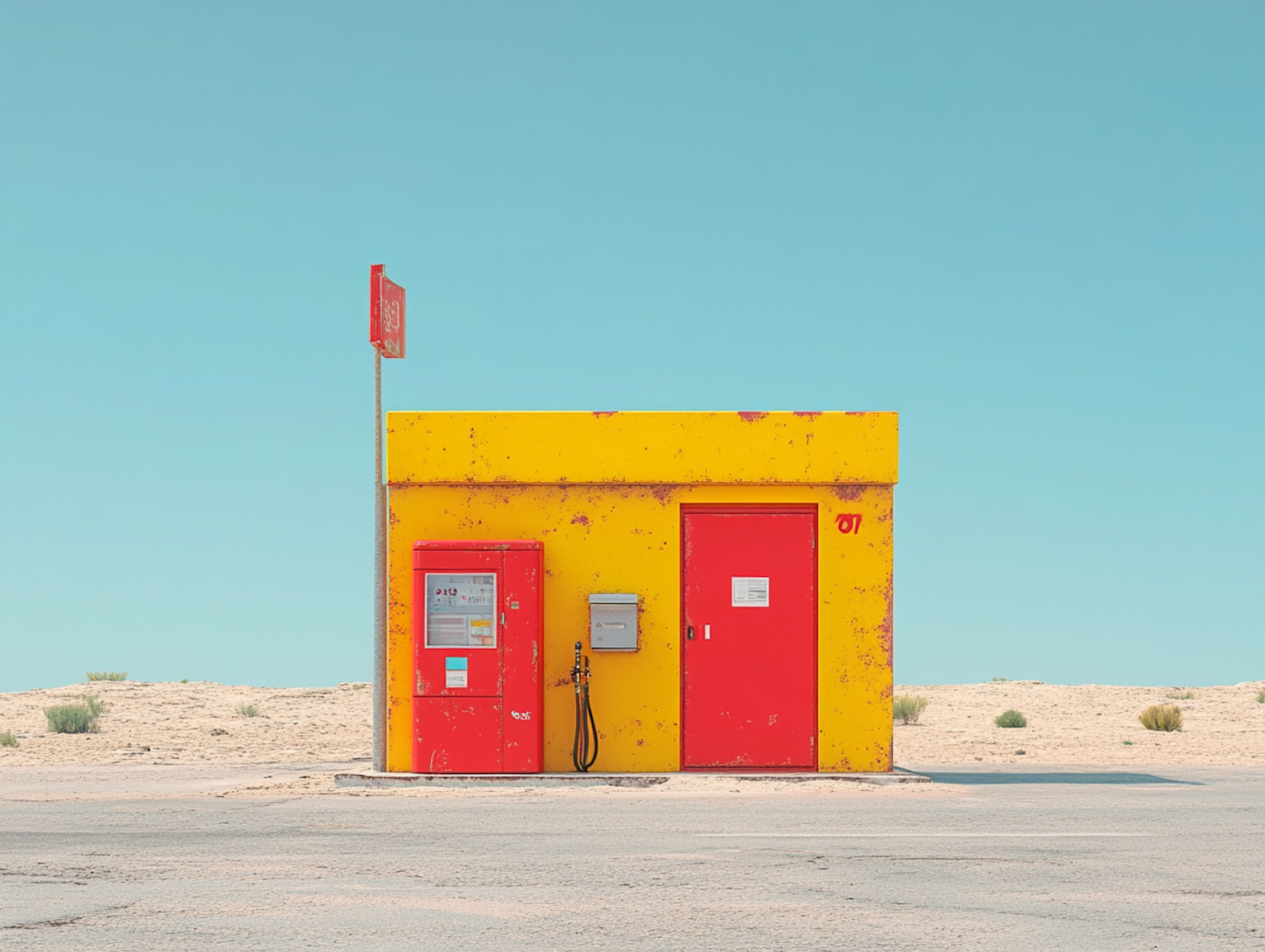 Vibrant yellow and red gas station in a desert setting, with clear blue skies and a sense of isolation.