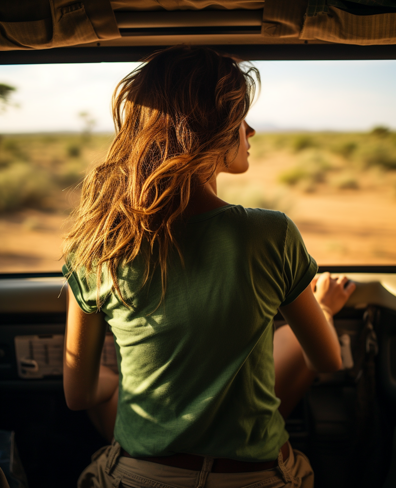 Woman with wavy brown hair in a green t-shirt sits in a vehicle, gazing at a sunlit landscape. Warm tones and serene atmosphere.