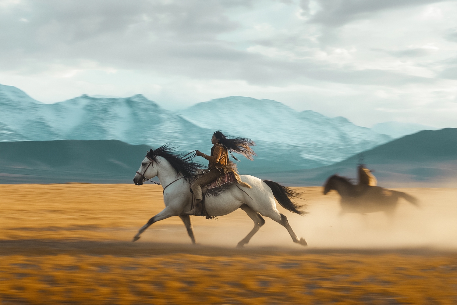 Two riders gallop across a golden desert with snow-capped mountains in the background, creating a stunning contrast of motion and scenery.