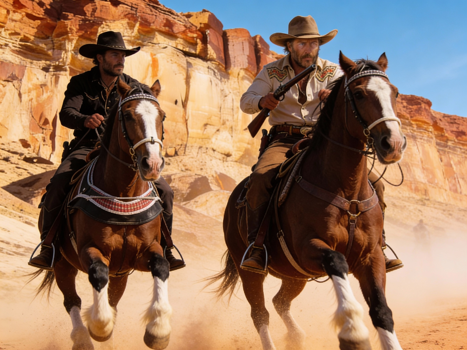 Two cowboys riding horses through a desert canyon, showcasing dynamic motion and a vivid sandstone backdrop.