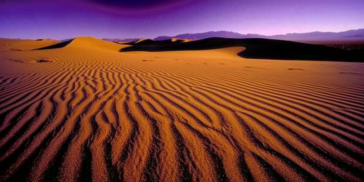 Golden sand dunes under a deep purple sky, with intricate wind patterns and distant mountains at dawn or dusk.