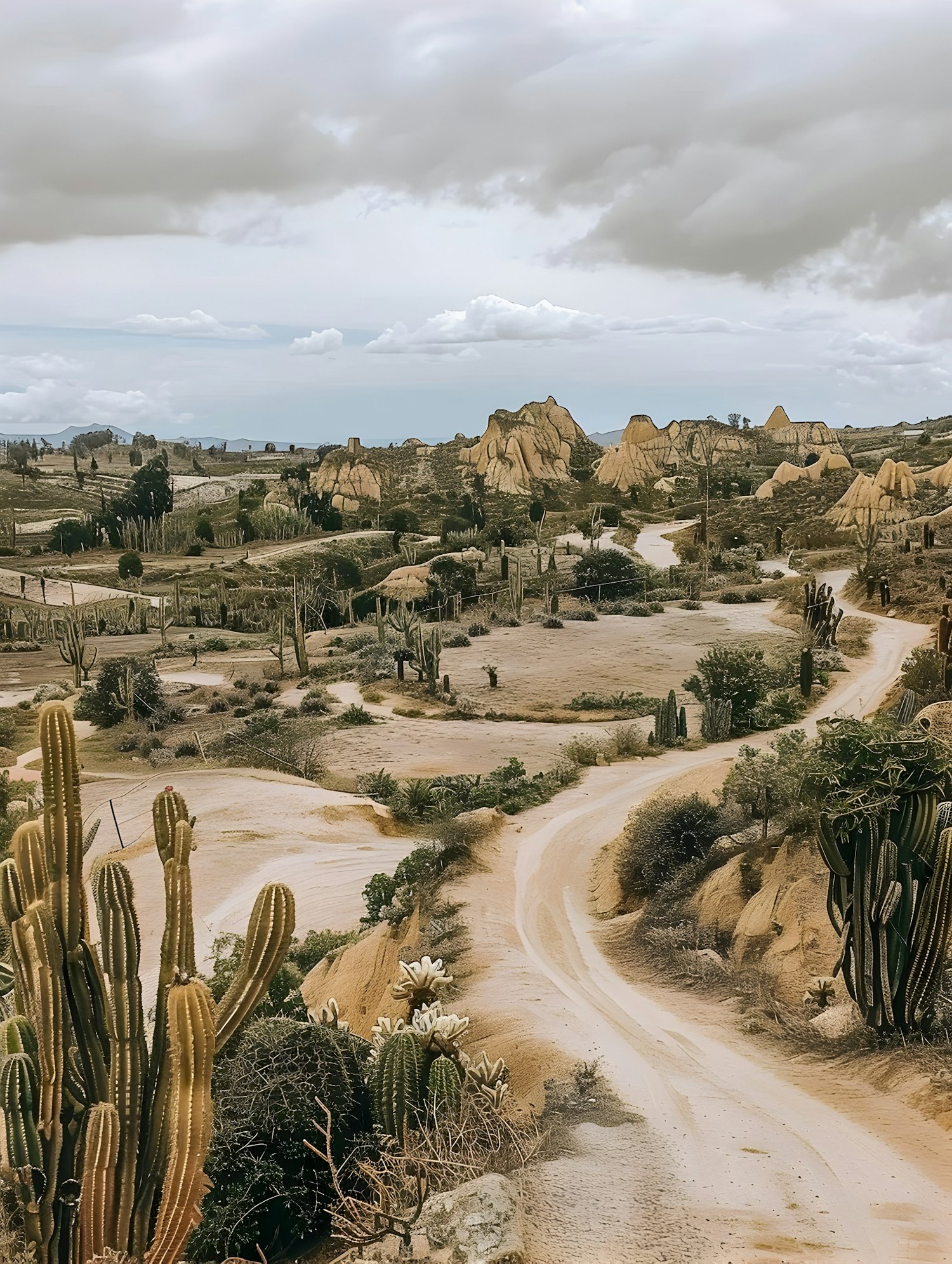Expansive desert landscape with winding paths, tall cacti, unique rock formations, and an overcast sky creating a serene atmosphere.