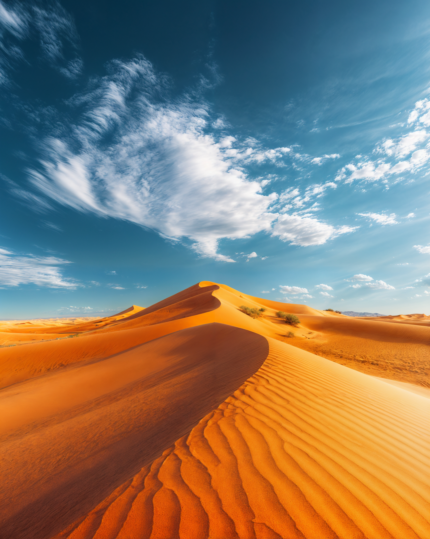 Golden sand dunes under a vibrant blue sky with wispy clouds, creating a stunning desert landscape.