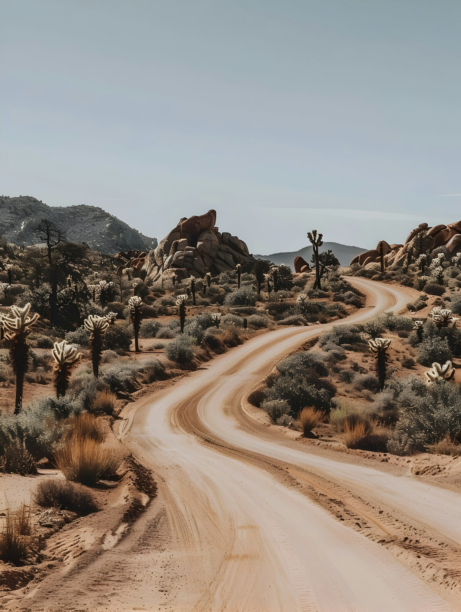 Winding dirt road through a desert landscape with Joshua trees and rocky hills under a clear blue sky.