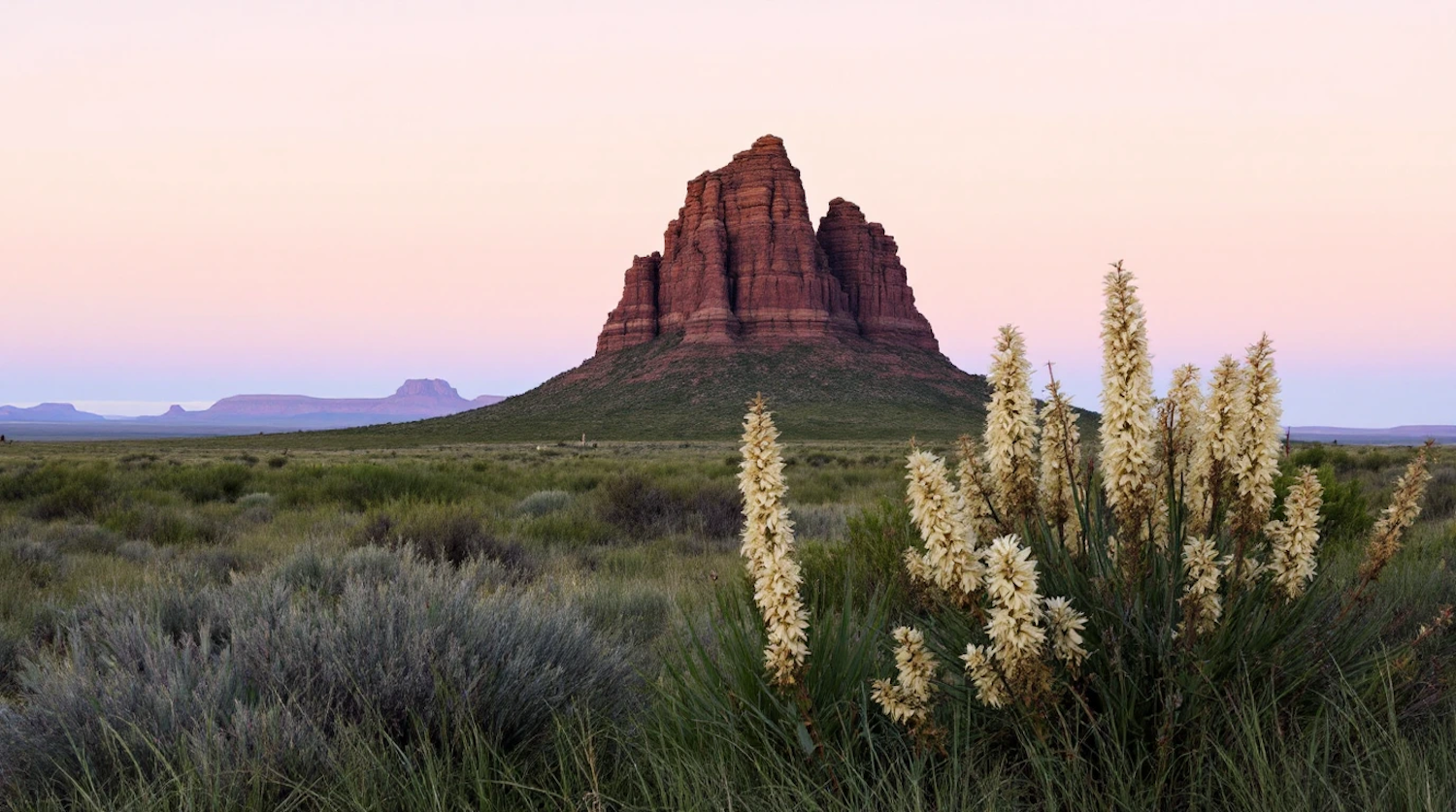 Majestic red rock formation in a serene desert landscape at dusk, with flowering desert plants in the foreground.