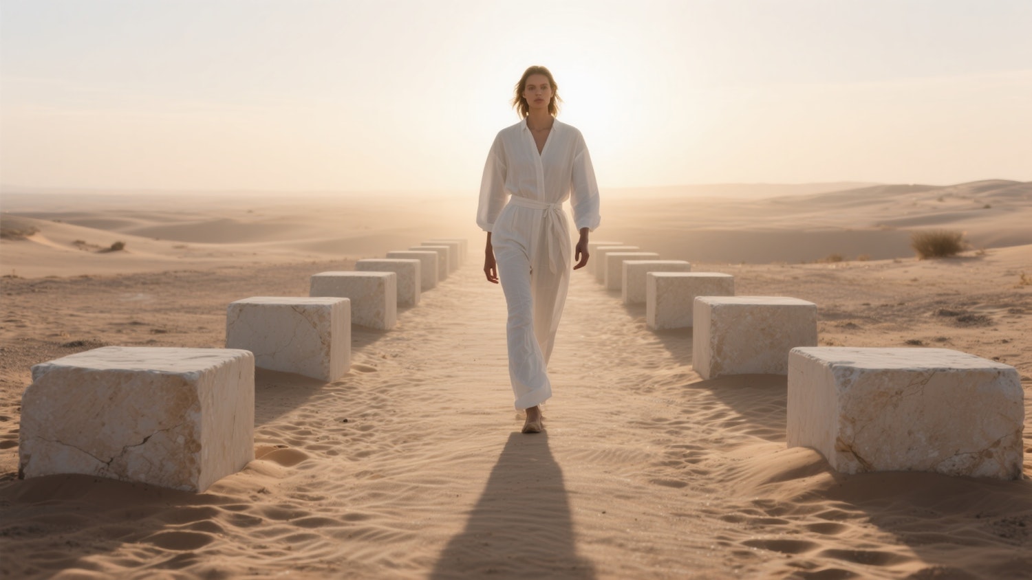 A serene desert scene with a person in white walking along a path lined with stone blocks, bathed in golden sunlight.
