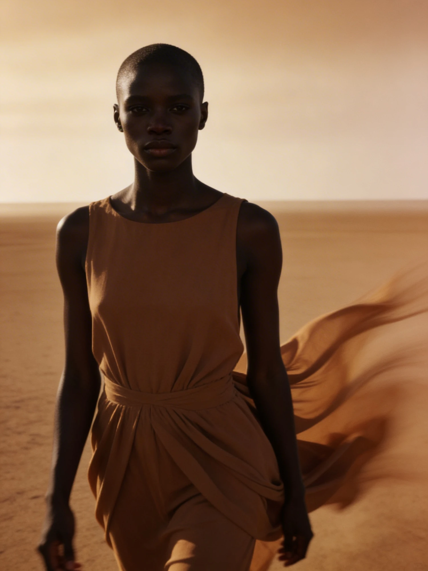 A serene portrait of a woman in a flowing dress, standing in a desert with warm, earthy tones and a tranquil atmosphere.