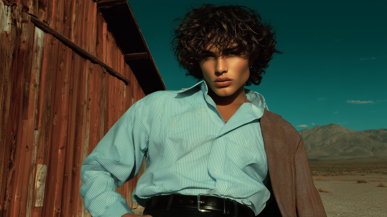 Stylish individual in a striped shirt and jacket poses against a rustic wooden wall with a desert and mountain backdrop.