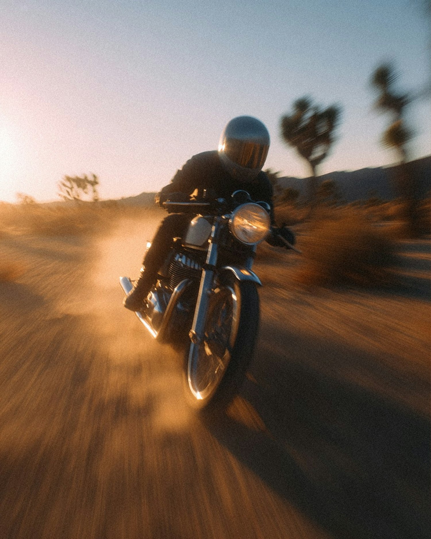 A motorcyclist speeds through a desert at sunset, leaving a trail of dust, with a classic bike and reflective helmet under a twilight sky.