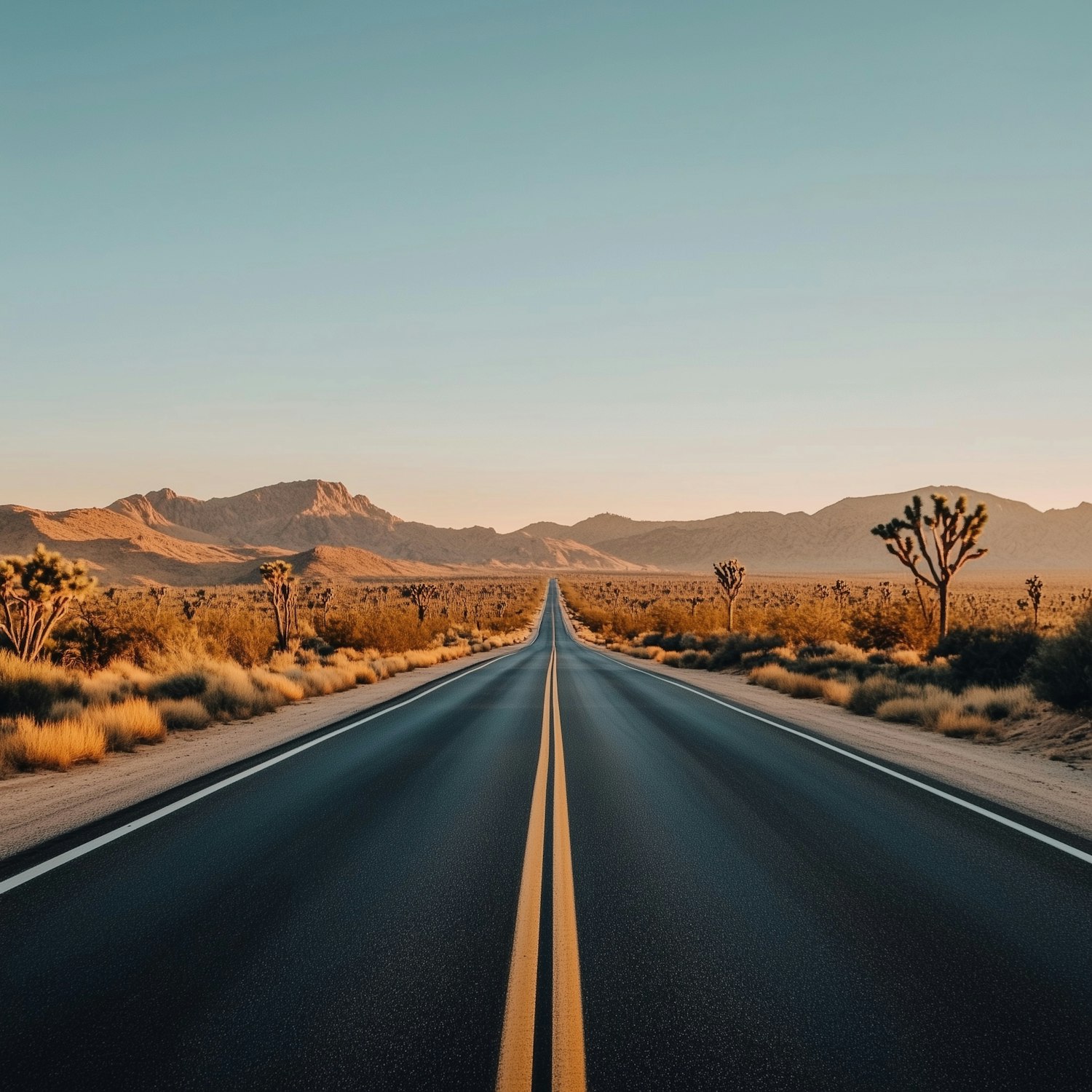 A straight desert road with yellow lines, Joshua trees, and distant mountains under a clear blue sky. Perfect for road trip vibes.