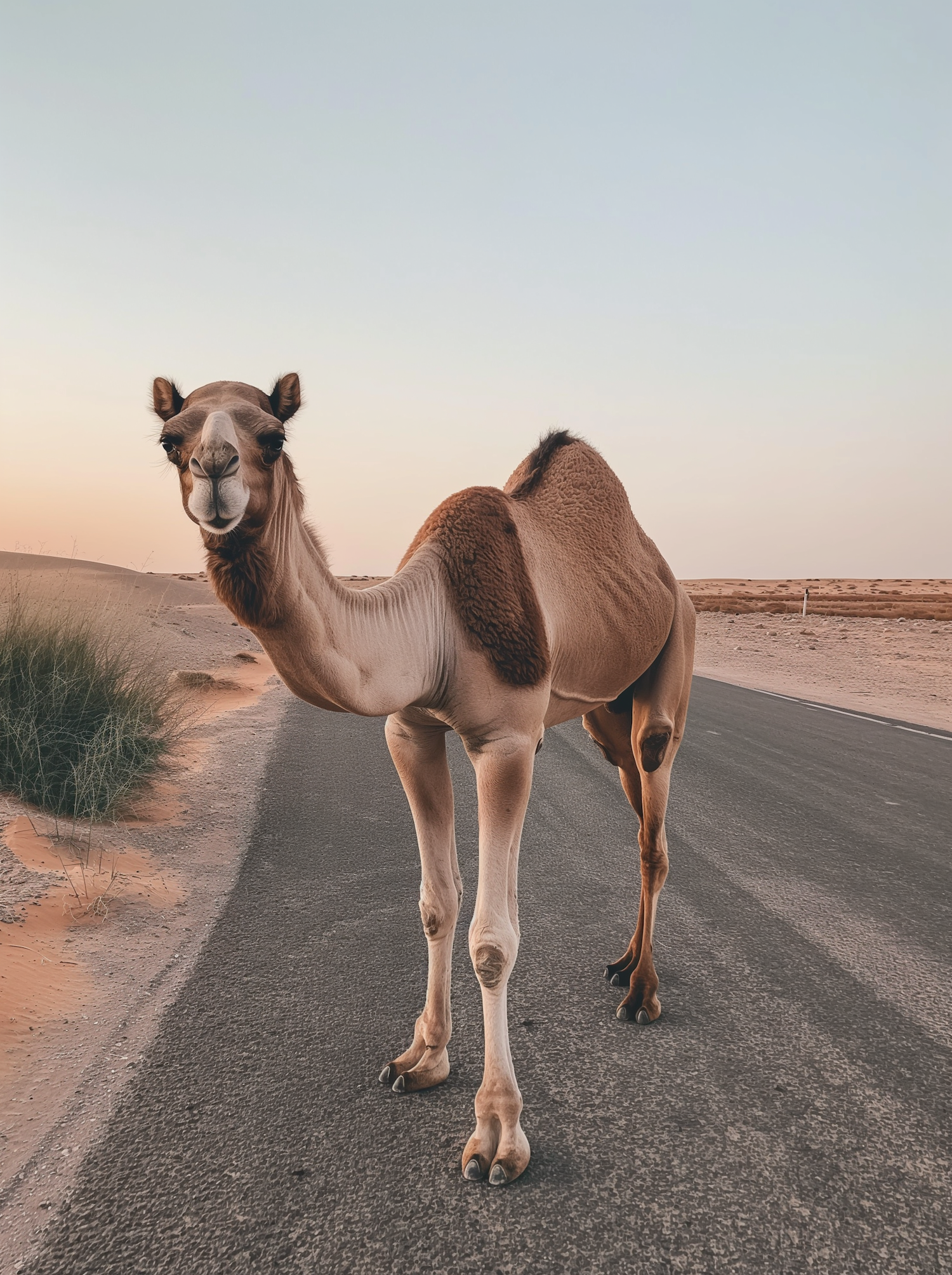 A curious camel stands on a desert road at sunset, surrounded by sand dunes and a gradient sky of orange and blue hues.