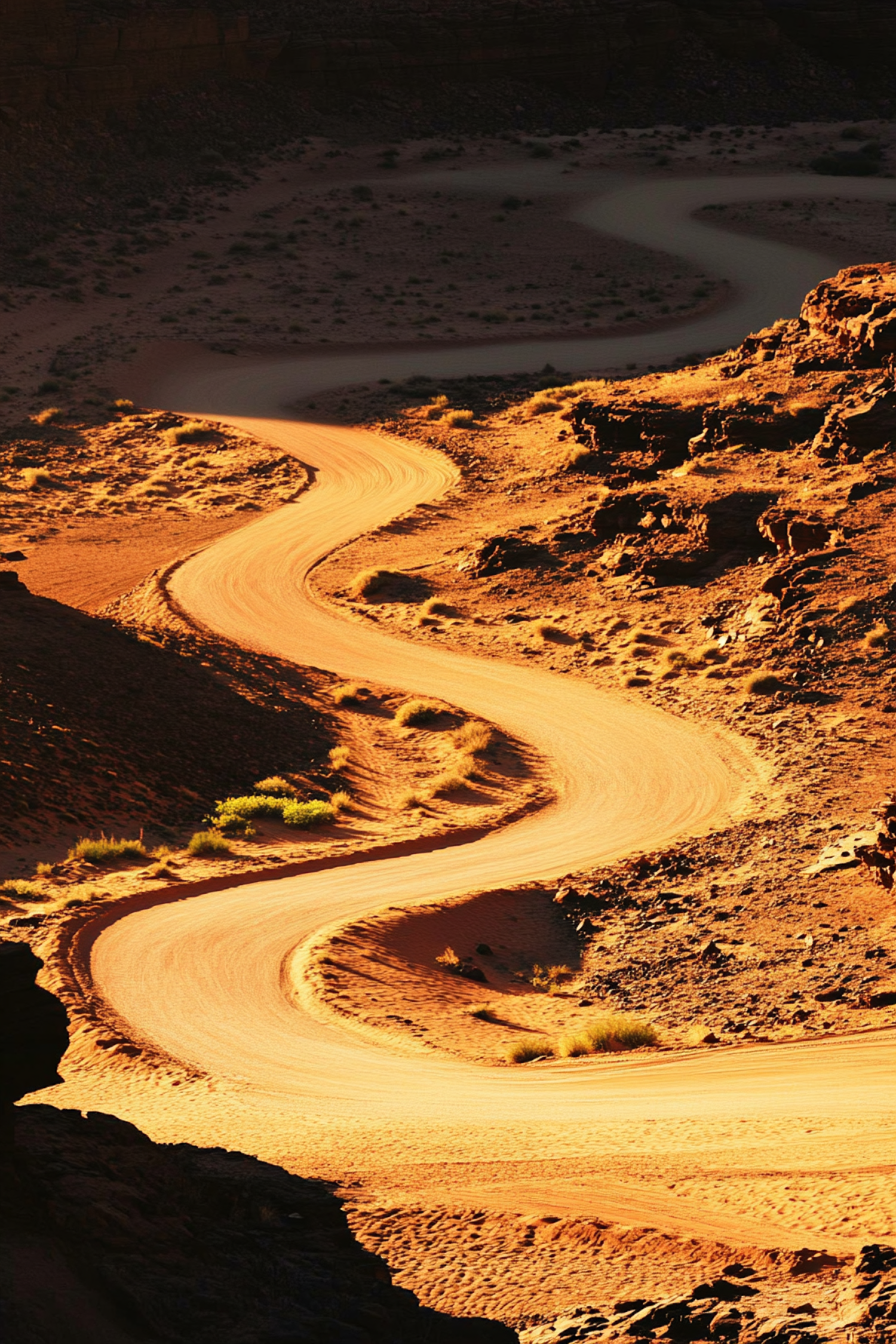 A winding dirt road in a sunlit desert landscape, surrounded by rocky terrain and sparse vegetation, creating a serene and remote atmosphere.